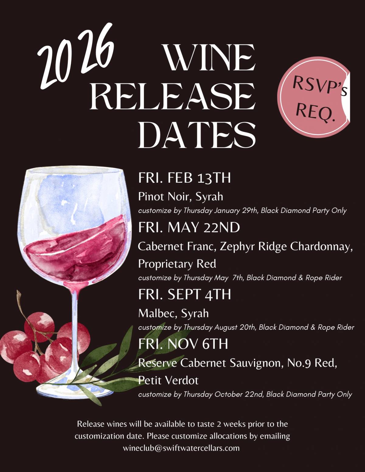 RSVPs are required for all events. To customize your wine allocation, please email wineclub@swiftwatercellars.com.