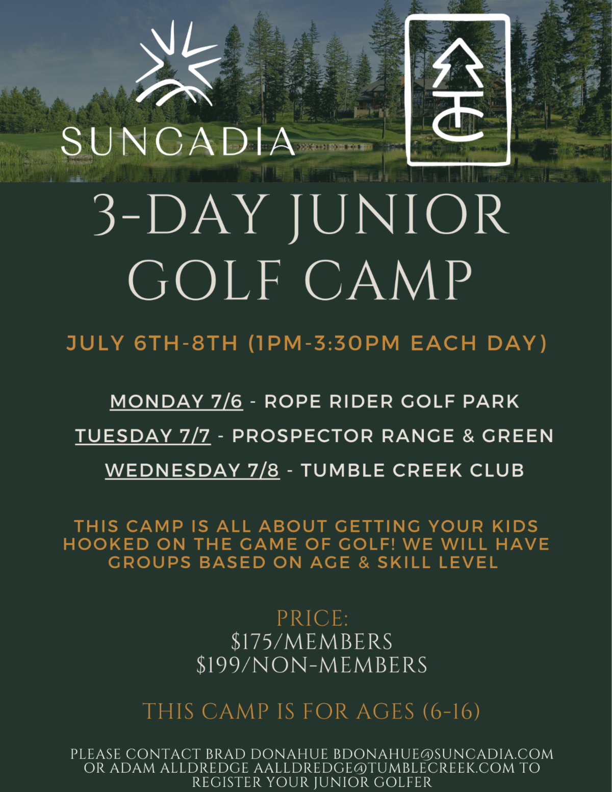 For young golfers, a 3-day junior camp is scheduled July 6–8, 2026 (1:00–3:30 PM each day):