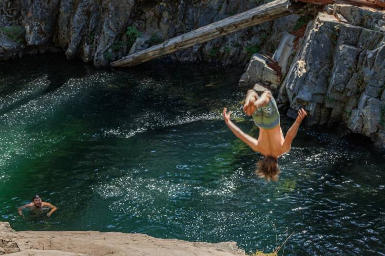 The spot is also known for its adventurous side, with a rope swing and nearby rock ledges that attract confident swimmers looking for a thrill. Others simply enjoy relaxing beside the river, soaking up the sunshine, and taking in the quiet beauty of this hidden mountain setting.