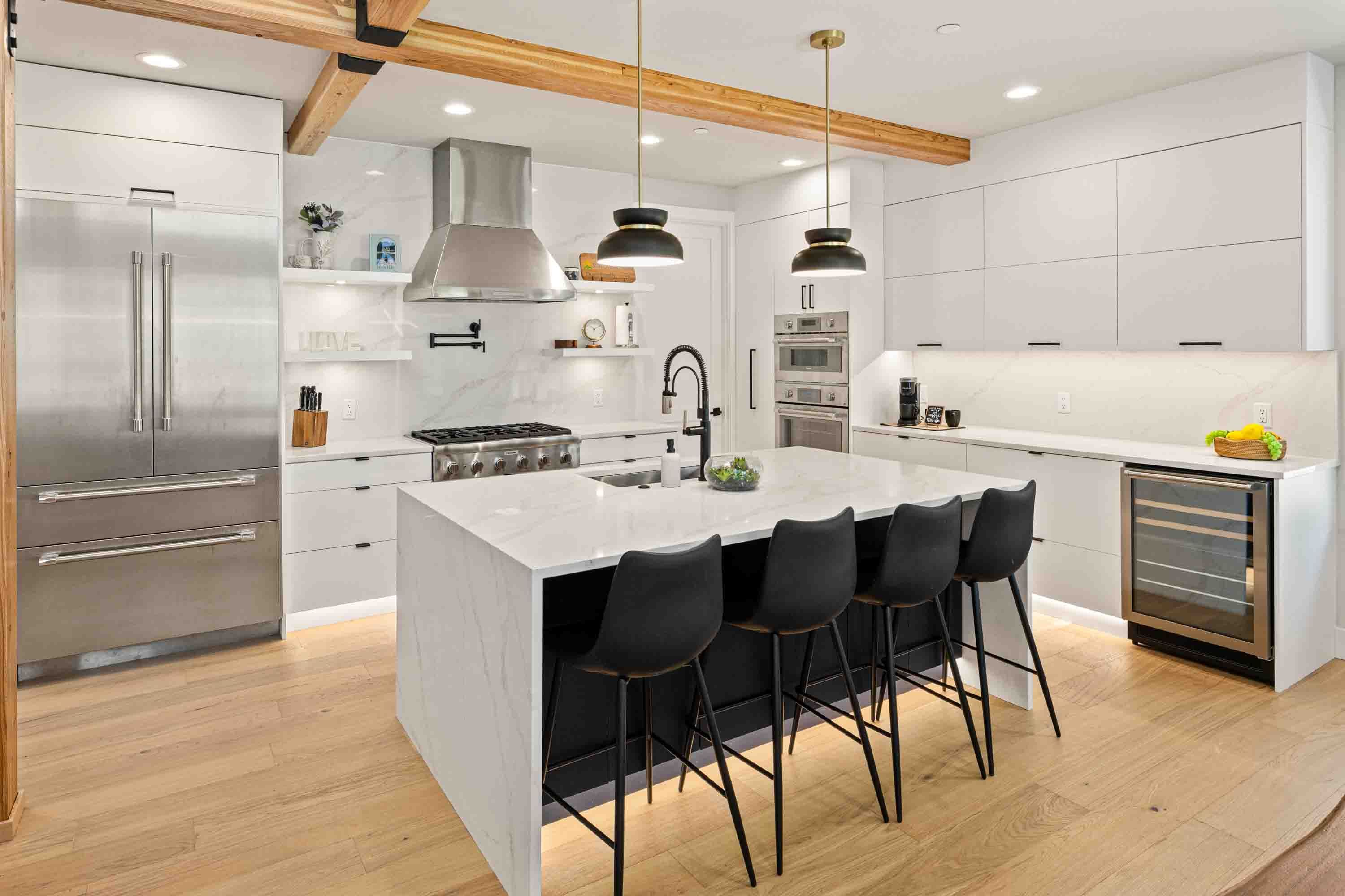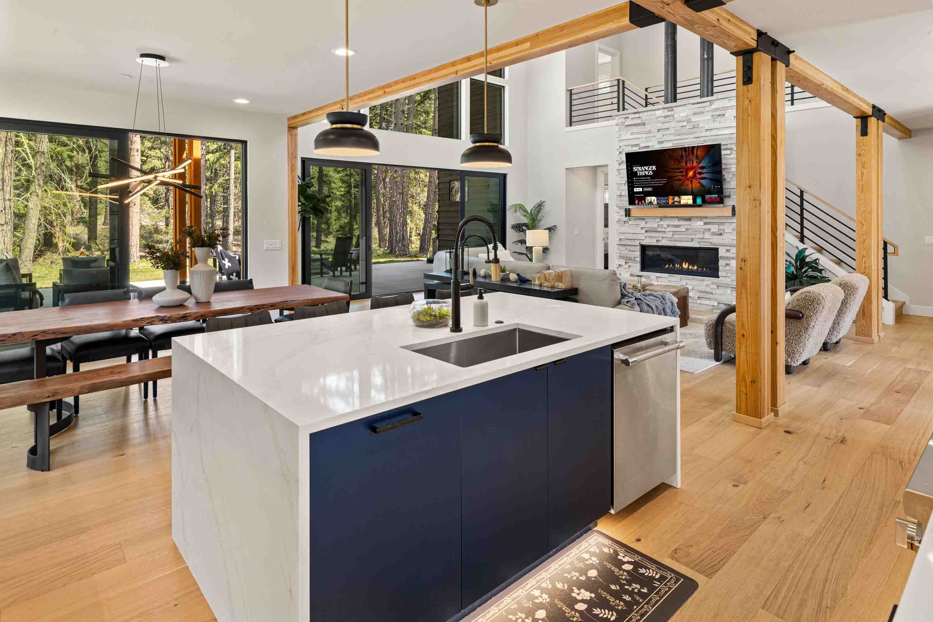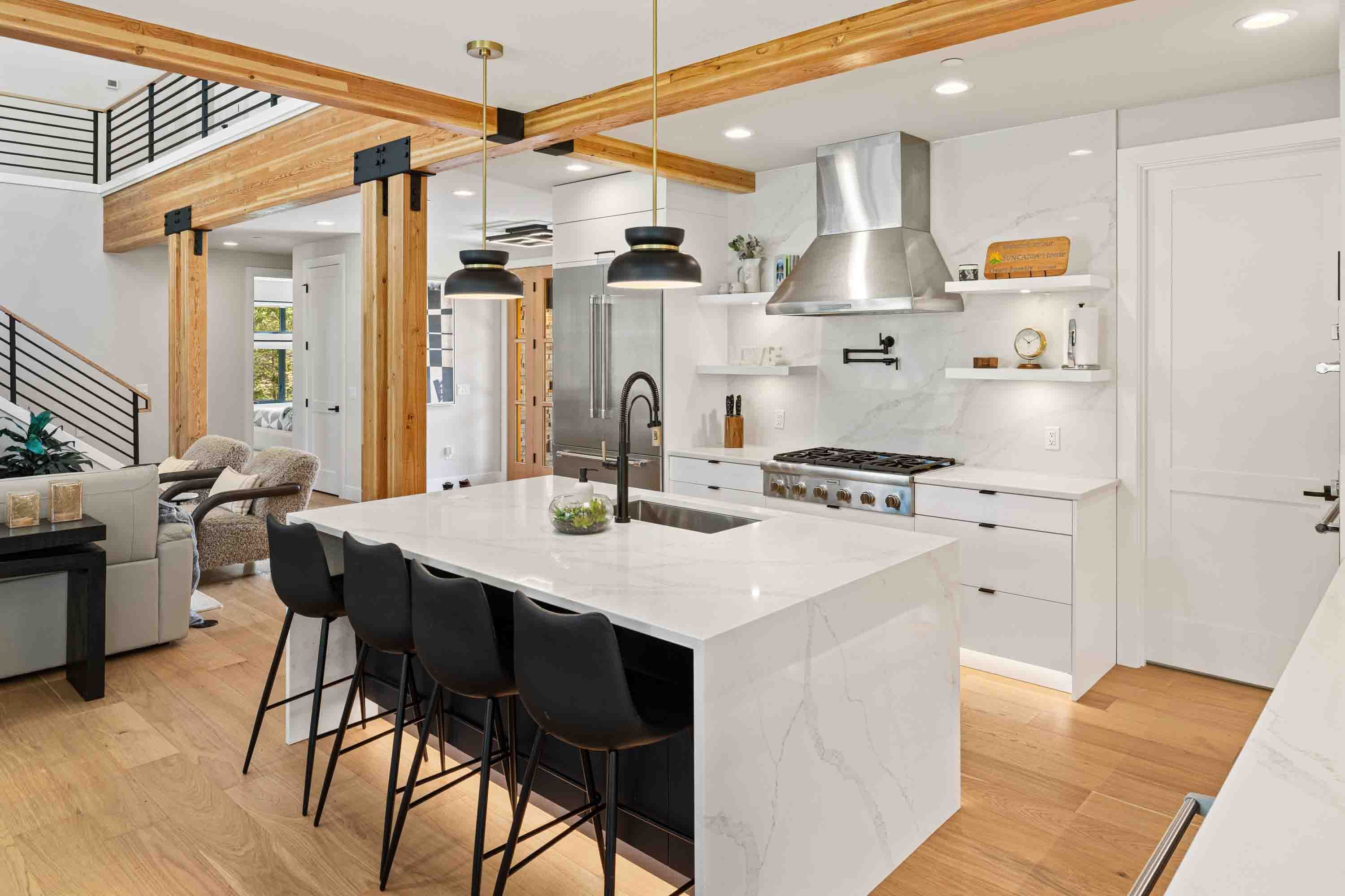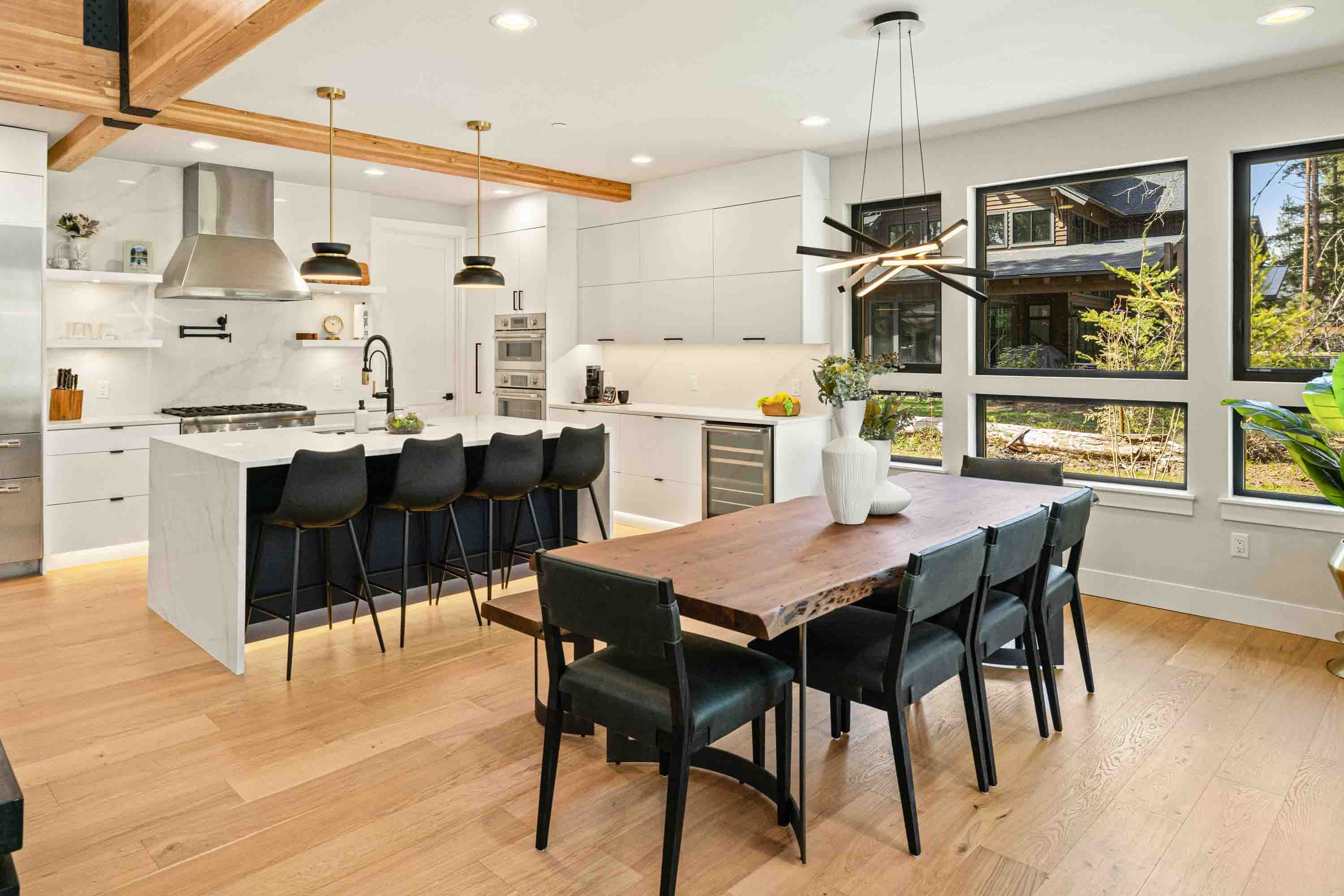The live-edge dining table and marble island make this space feel like it was designed for groups who love to eat well