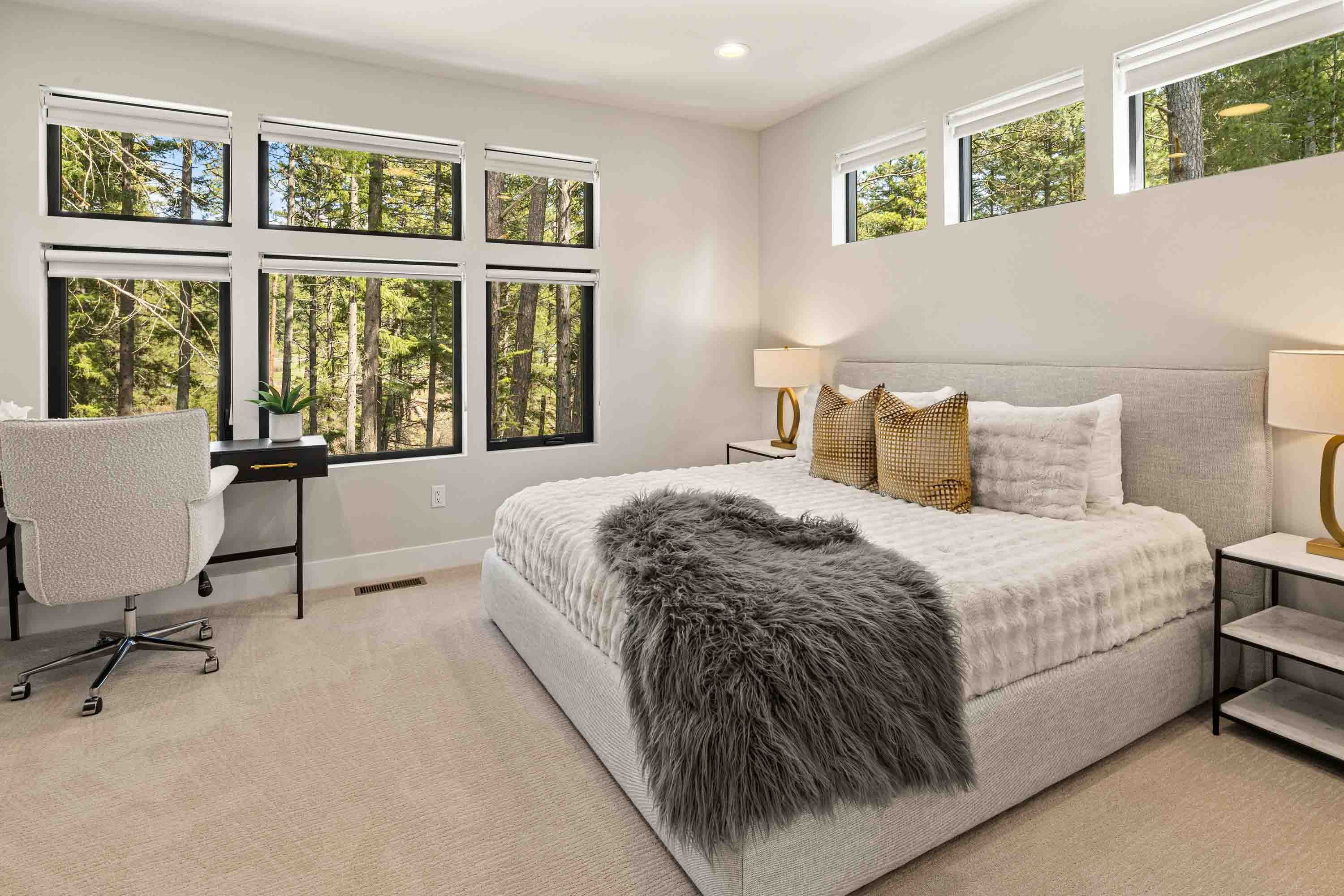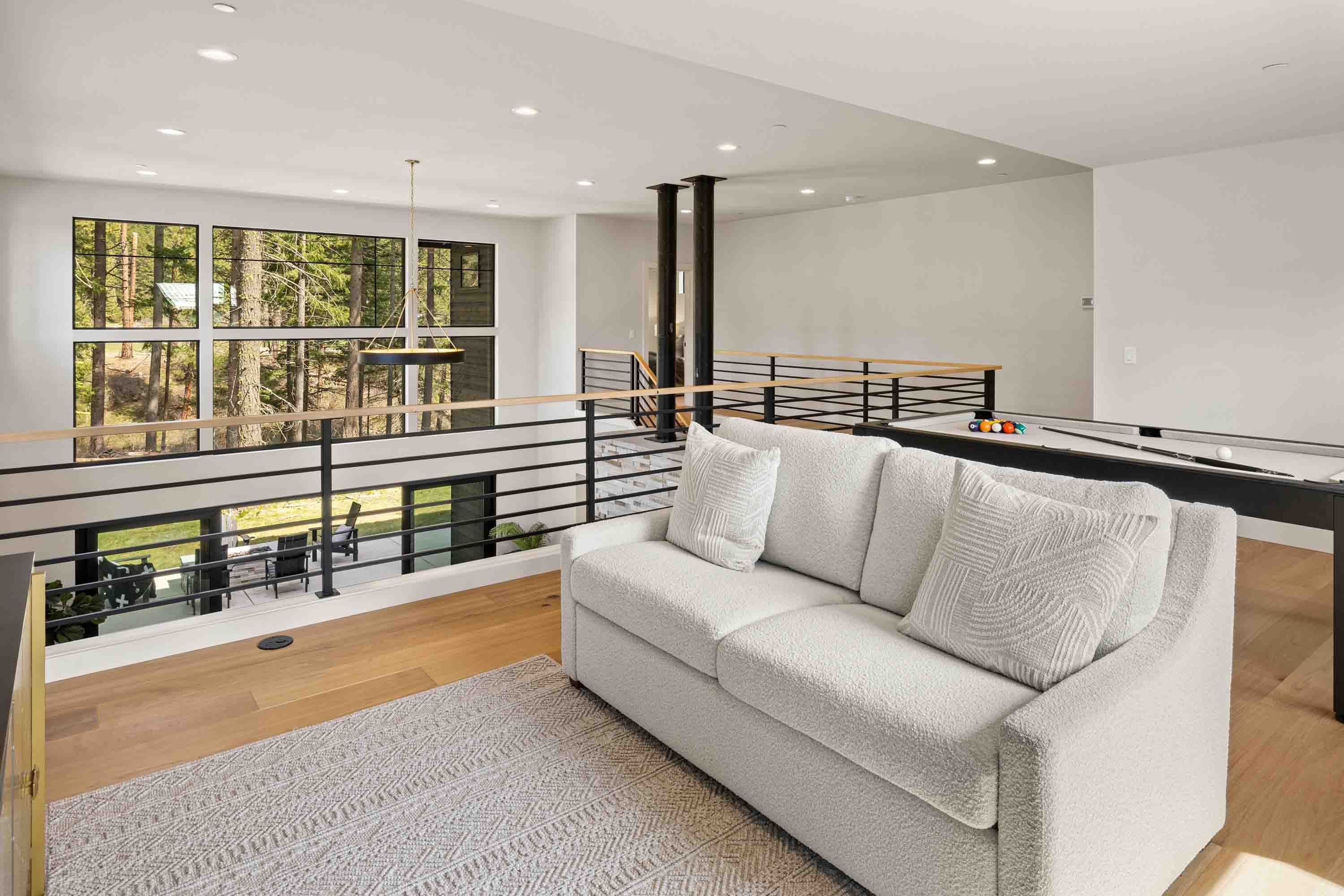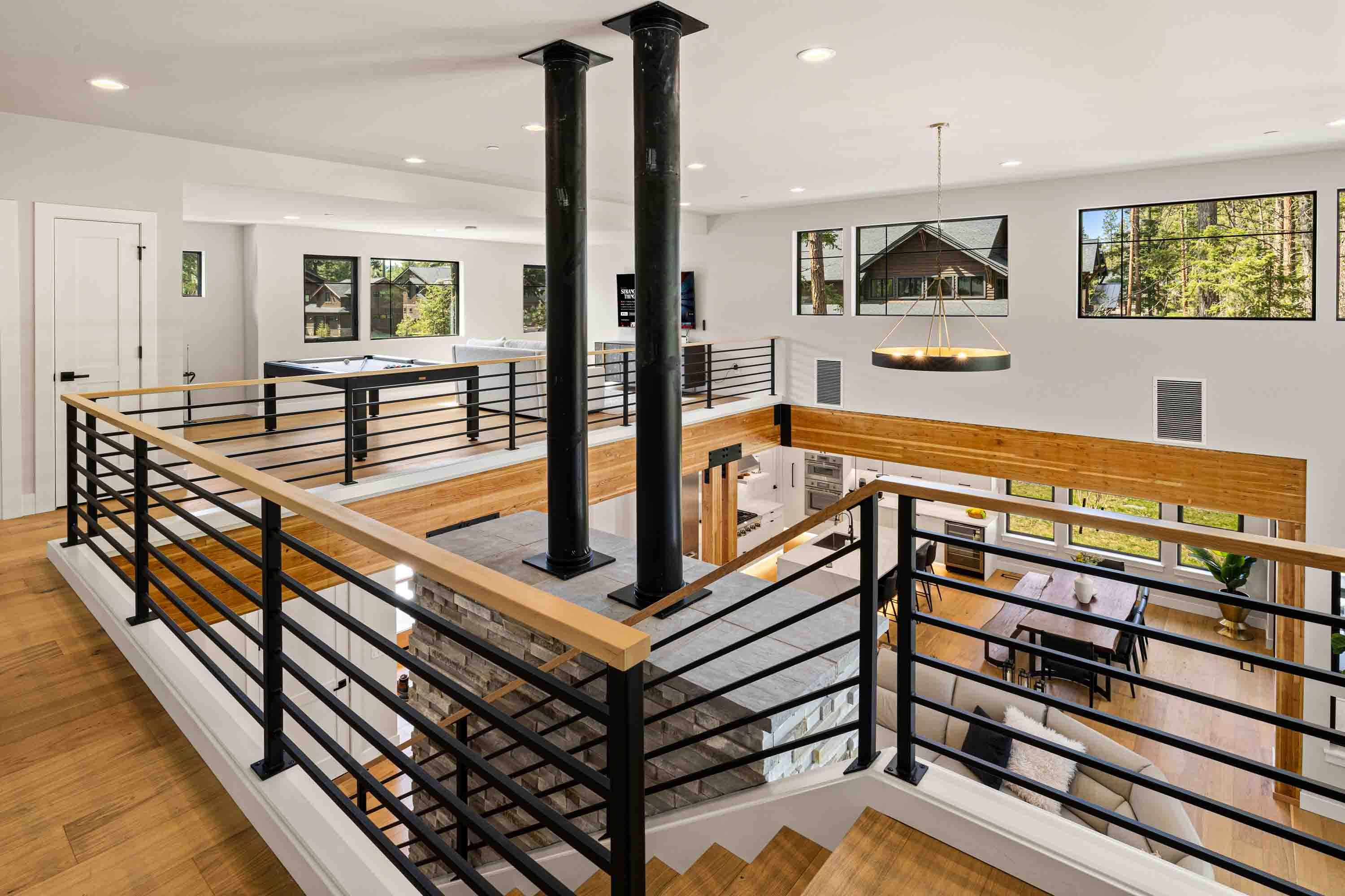The open railing and floor-to-ceiling windows make this loft feel connected to everything below it