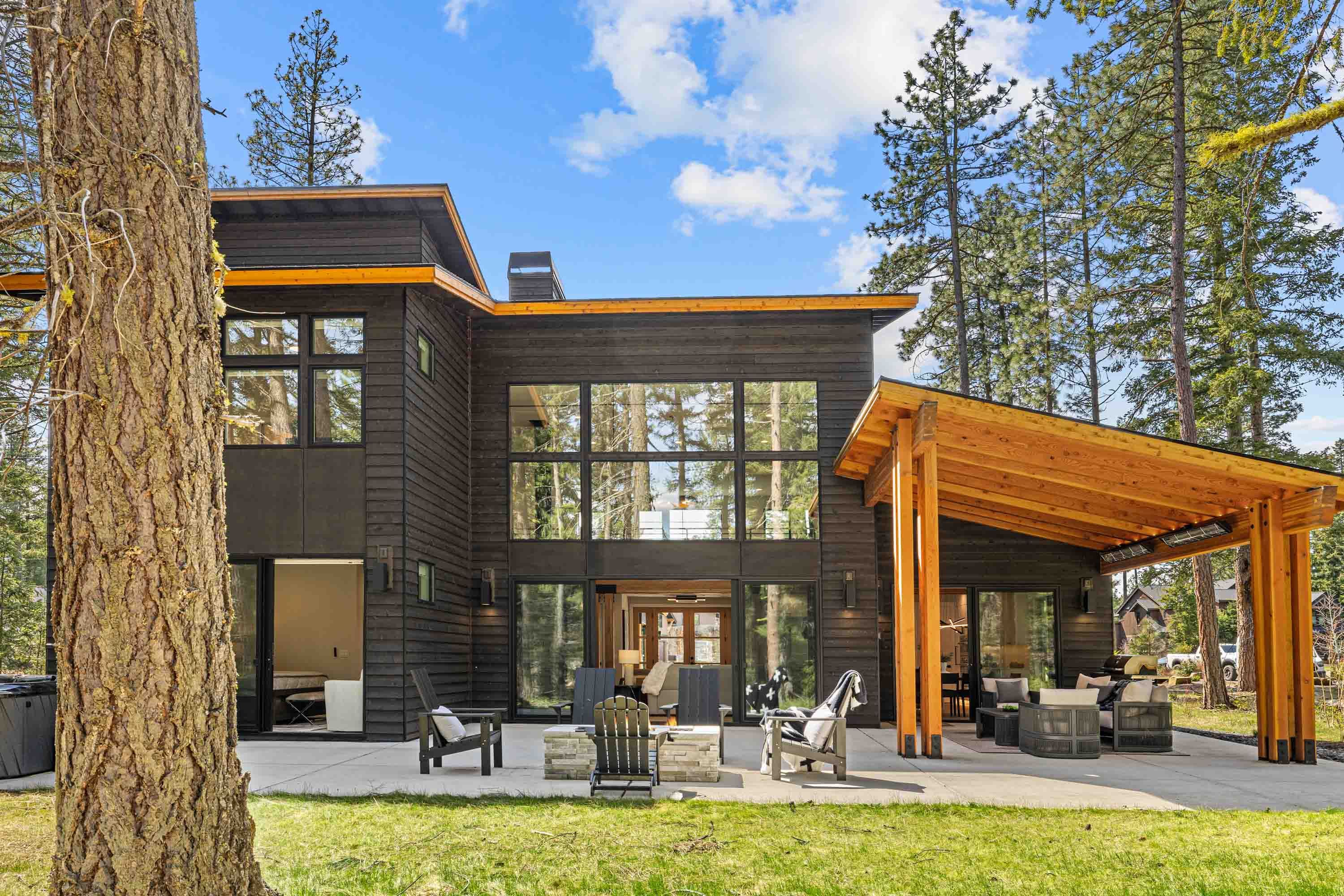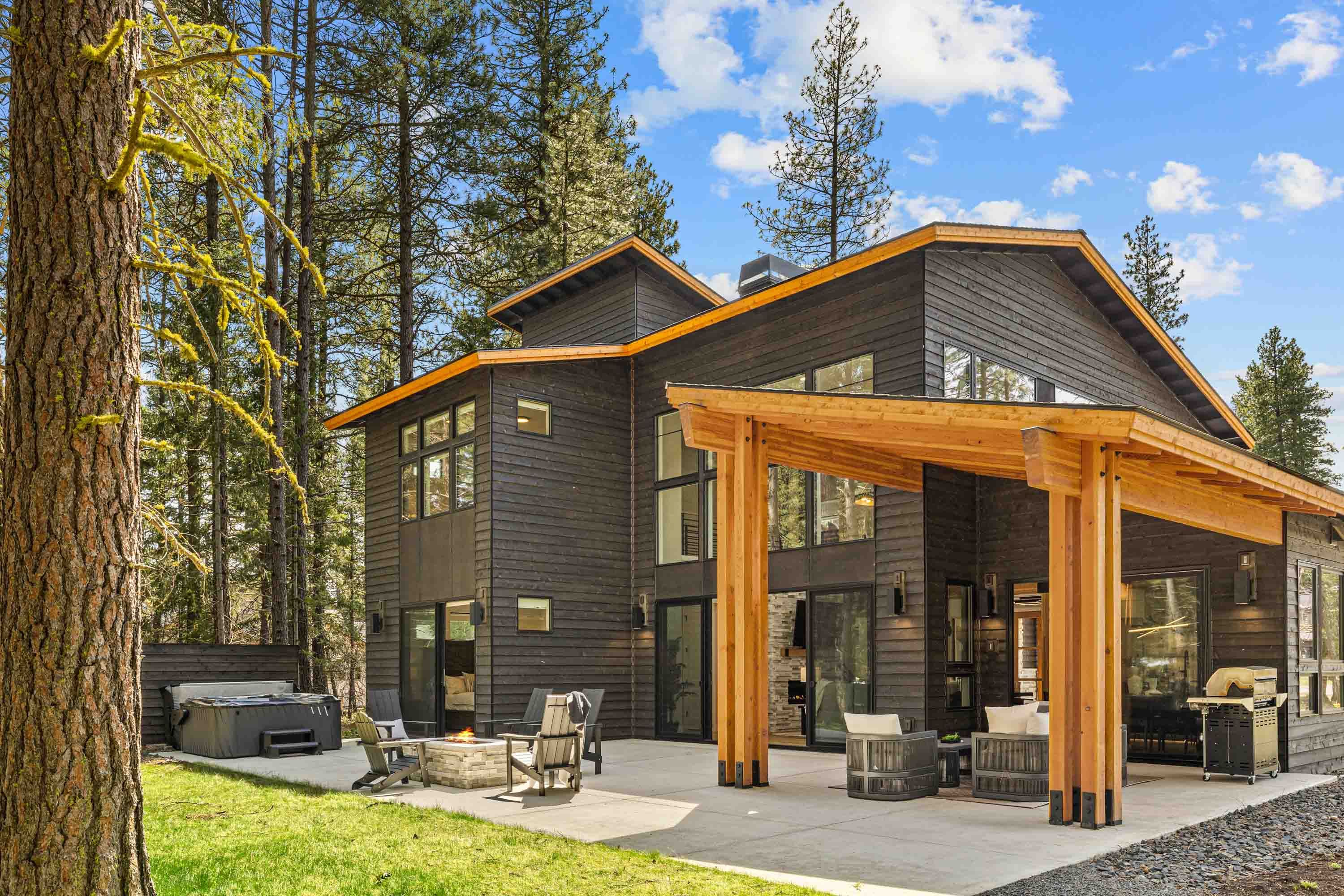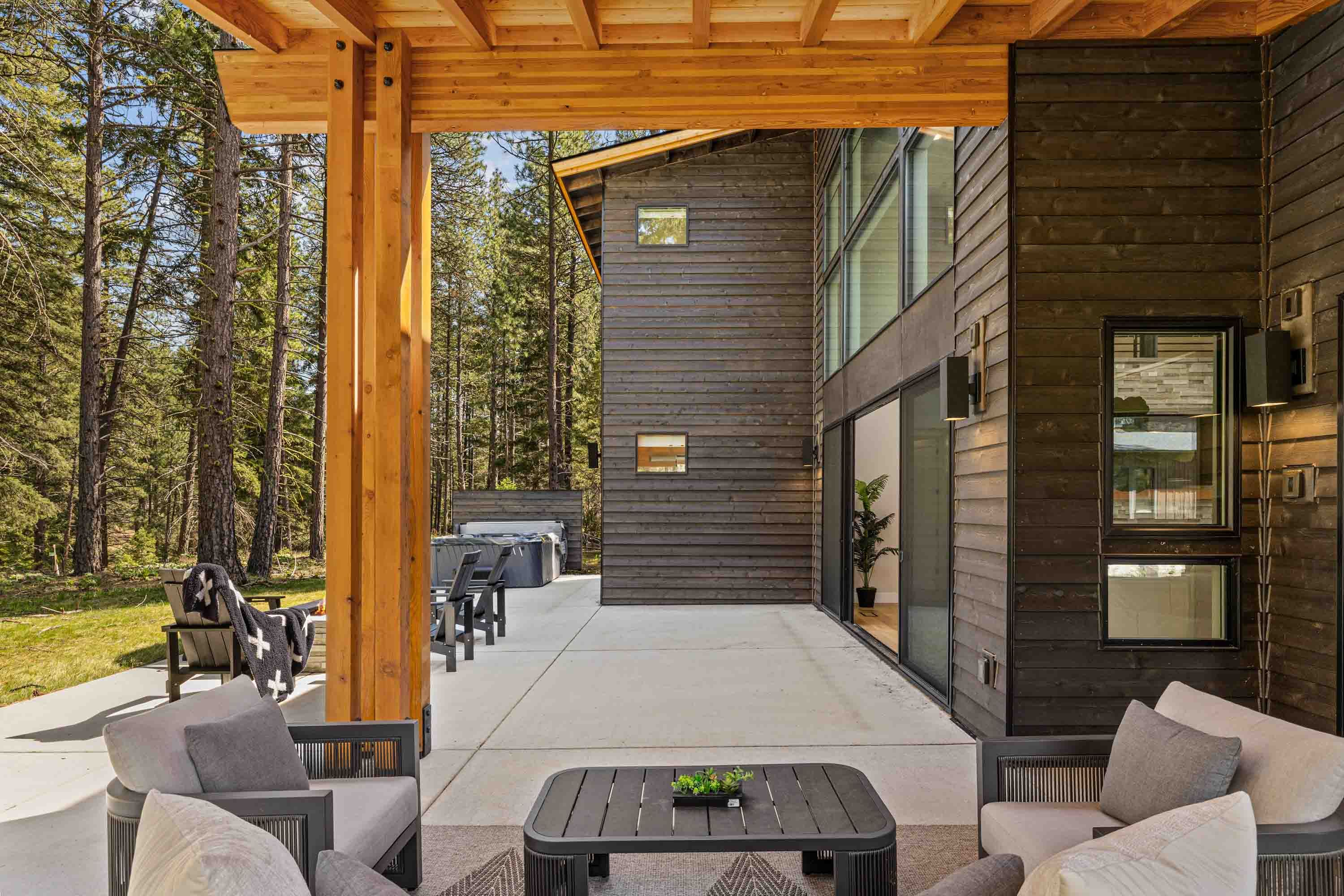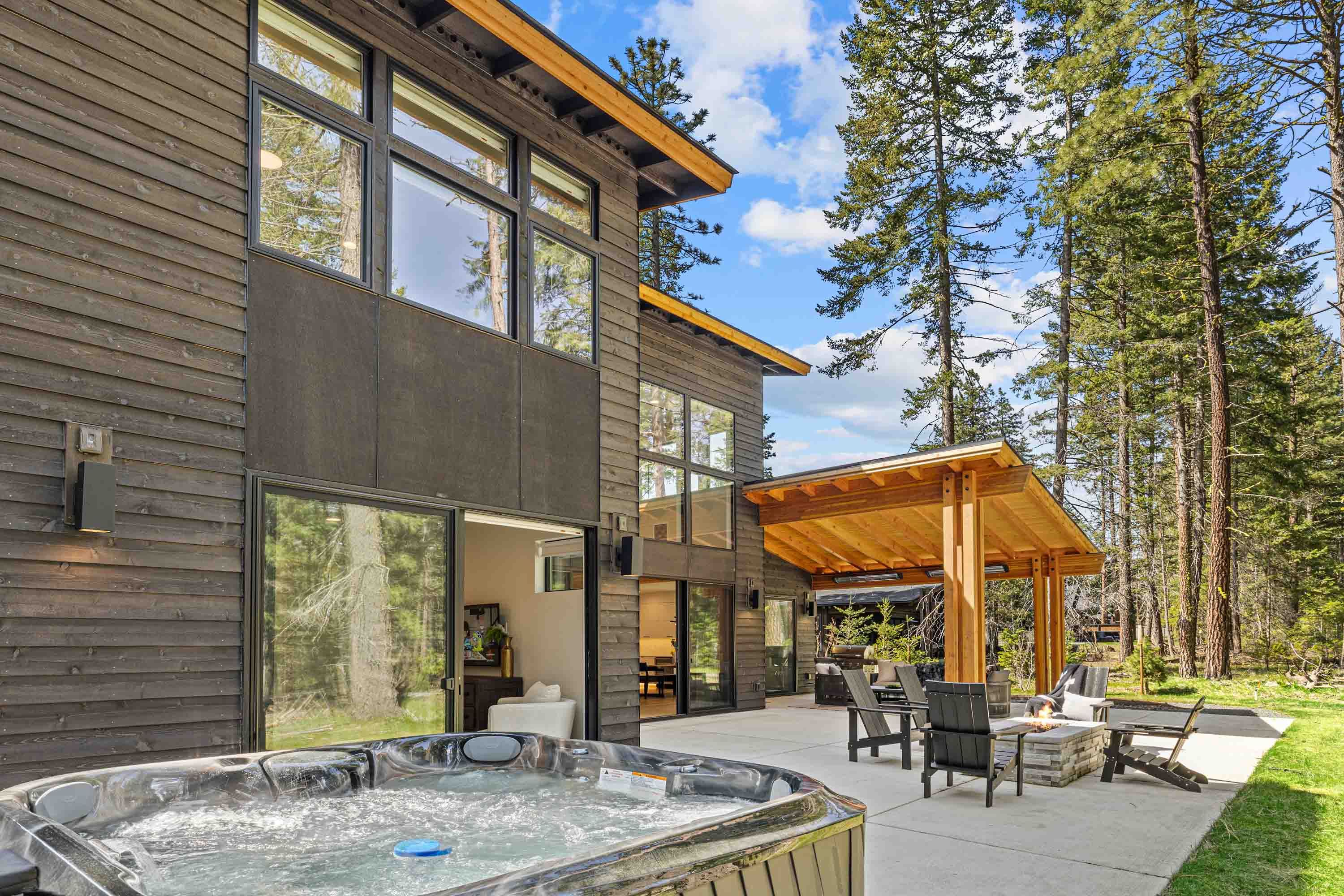 Hot tub, fire pit, covered patio, and floor-to-ceiling windows — the back of this house delivers