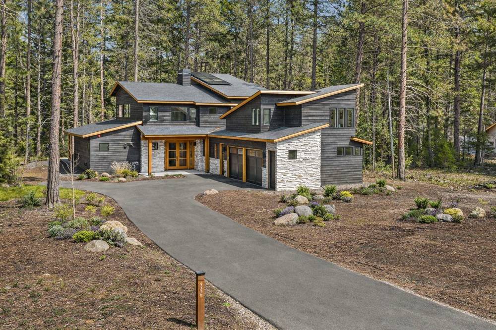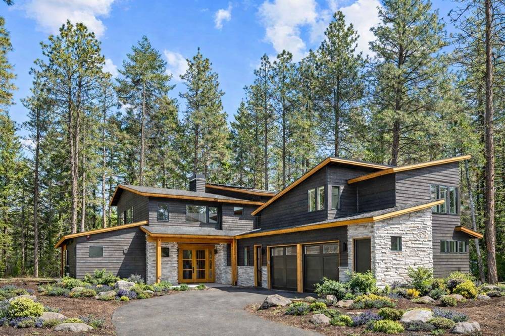 Dark siding, stacked stone, and warm wood details — this home looks exactly like how it feels inside