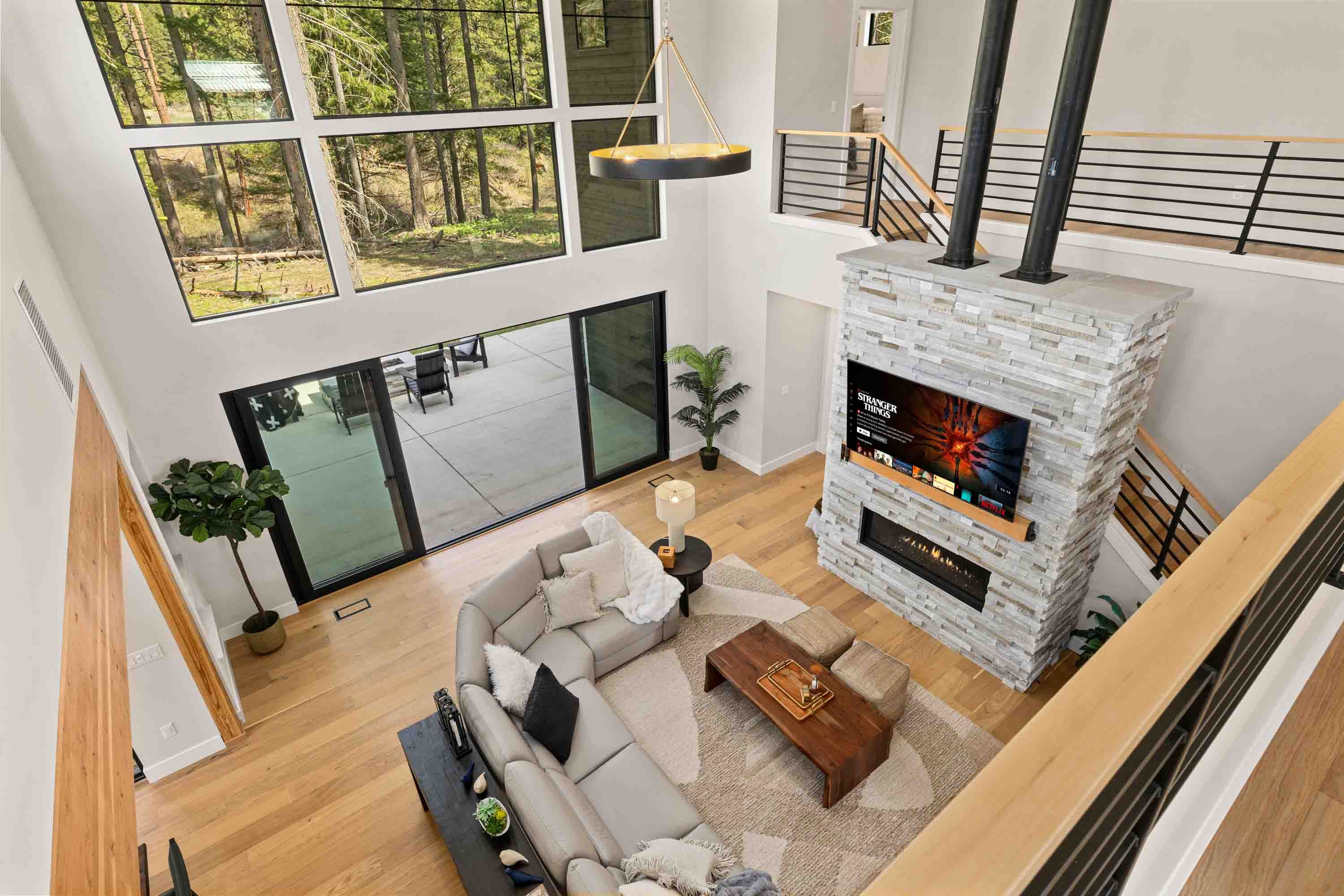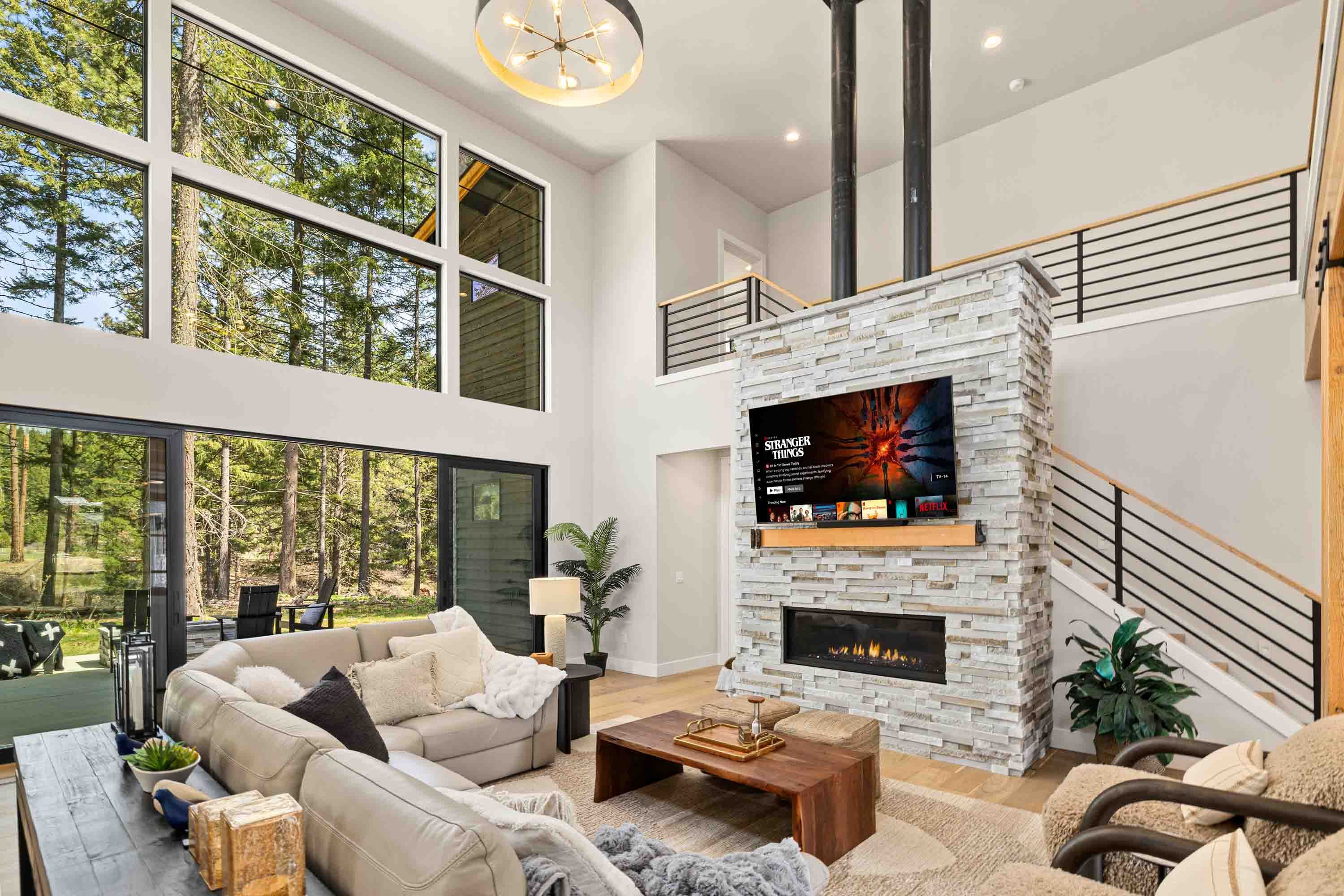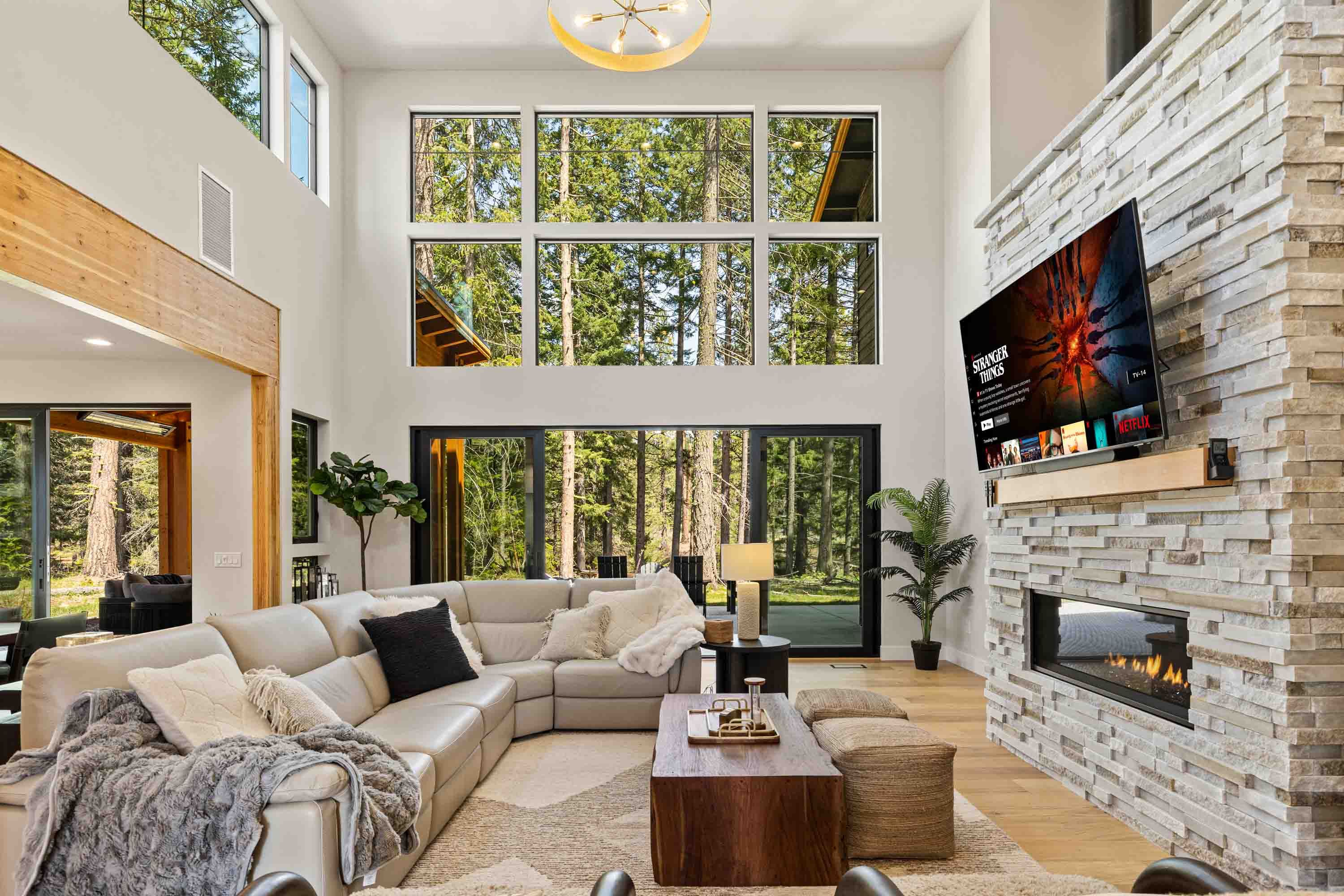 Floor-to-ceiling windows, a linear fireplace, and soaring ceilings make this room hard to leave