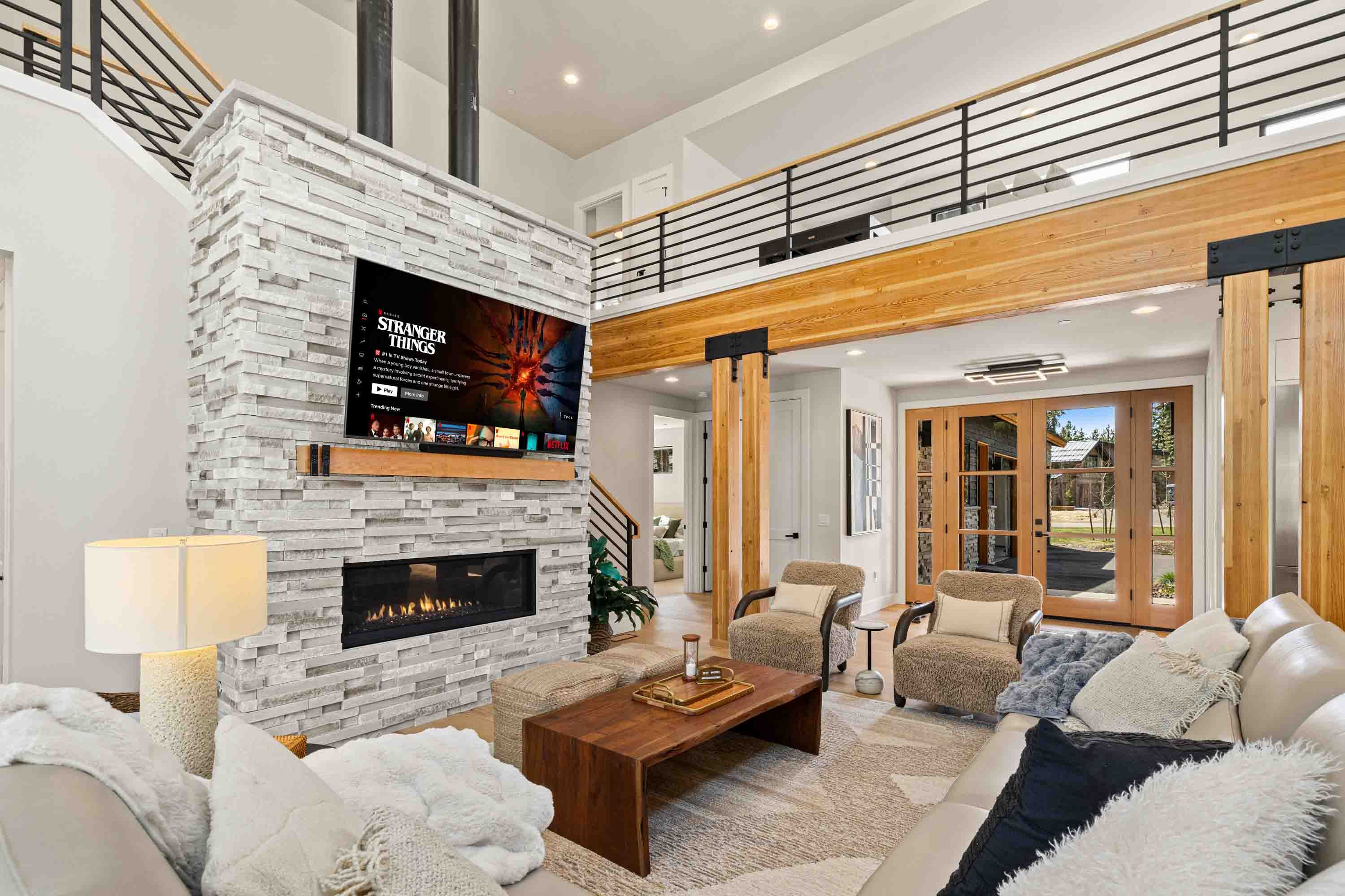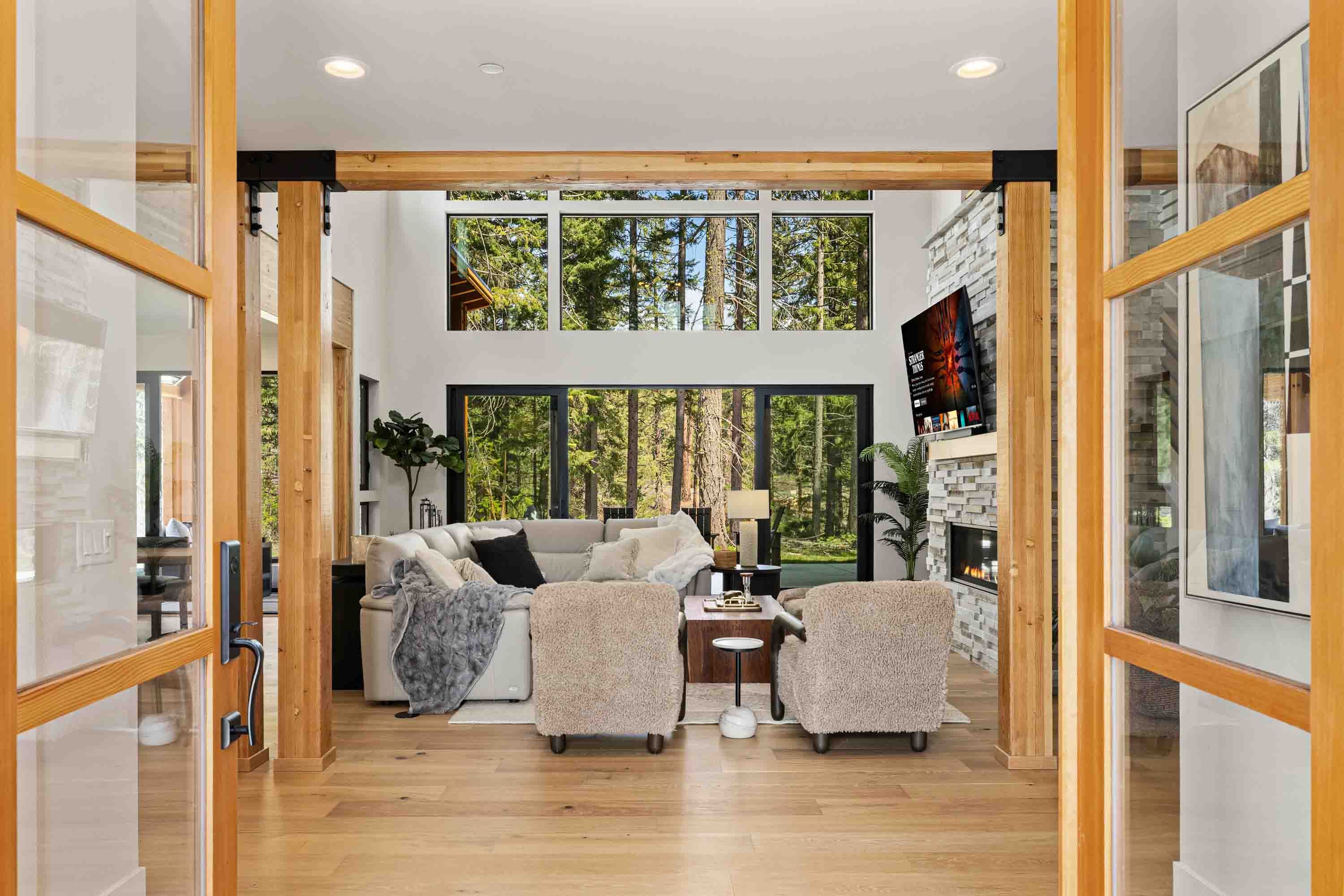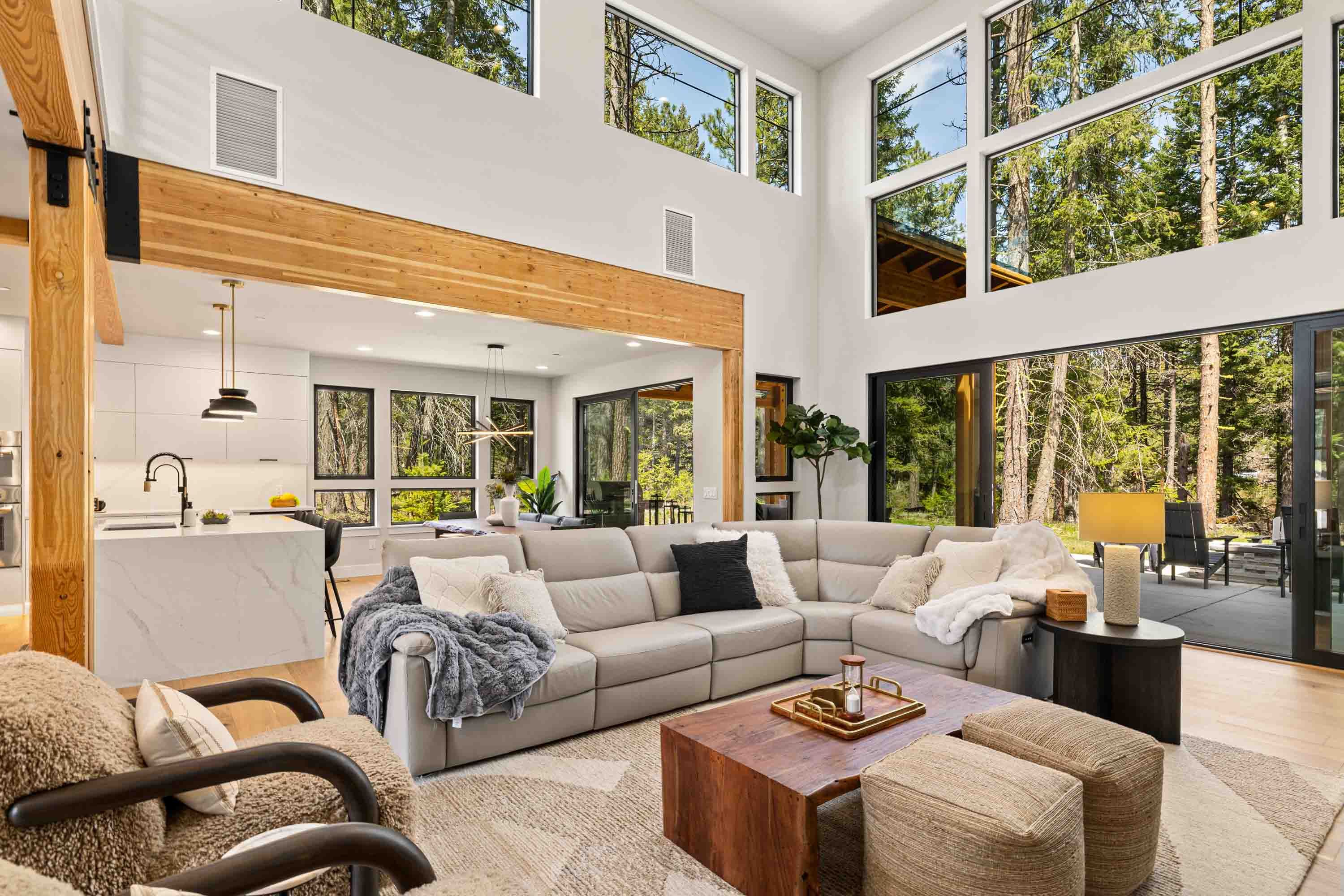 Floor-to-ceiling windows, a linear fireplace, and soaring ceilings make this room hard to leave
