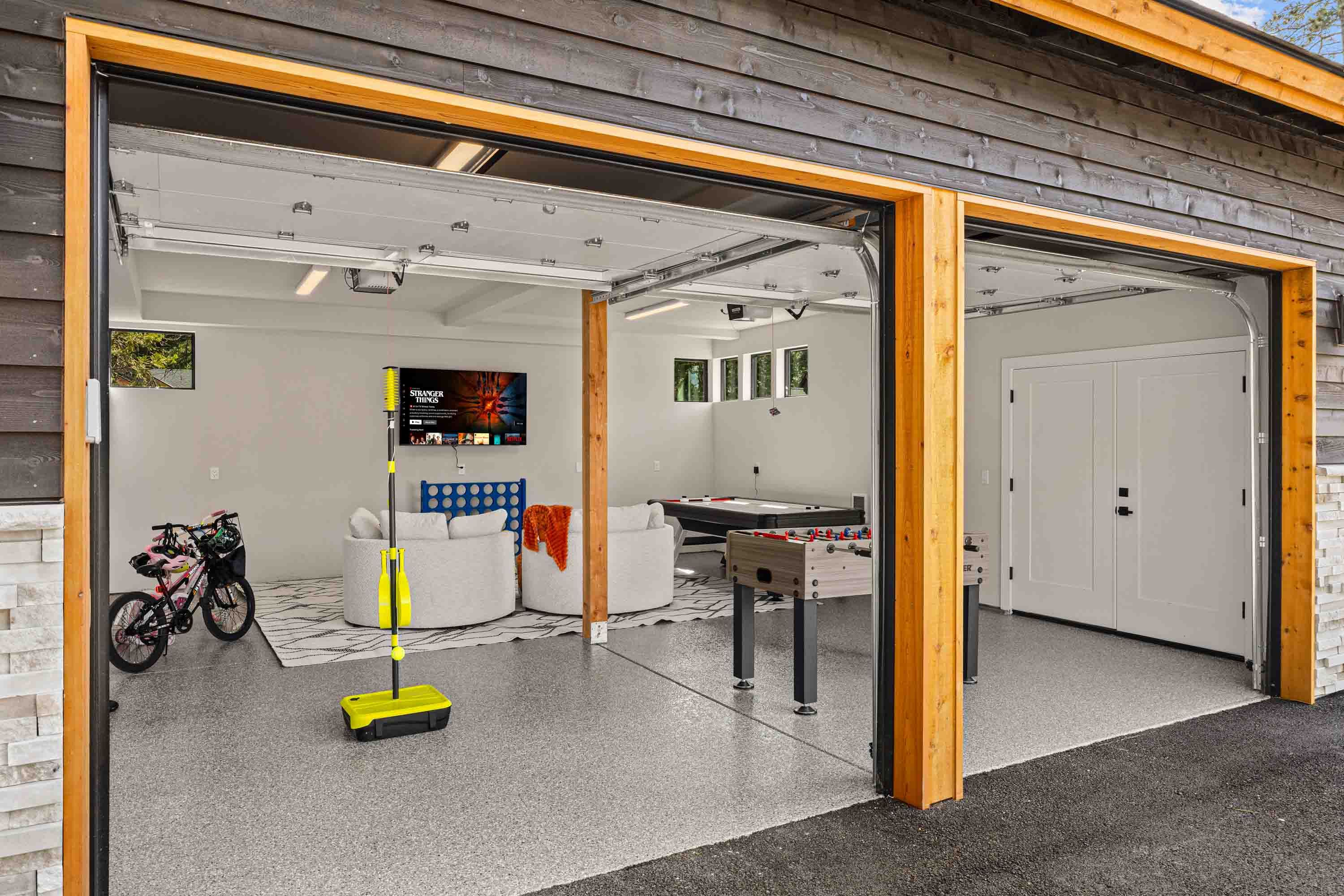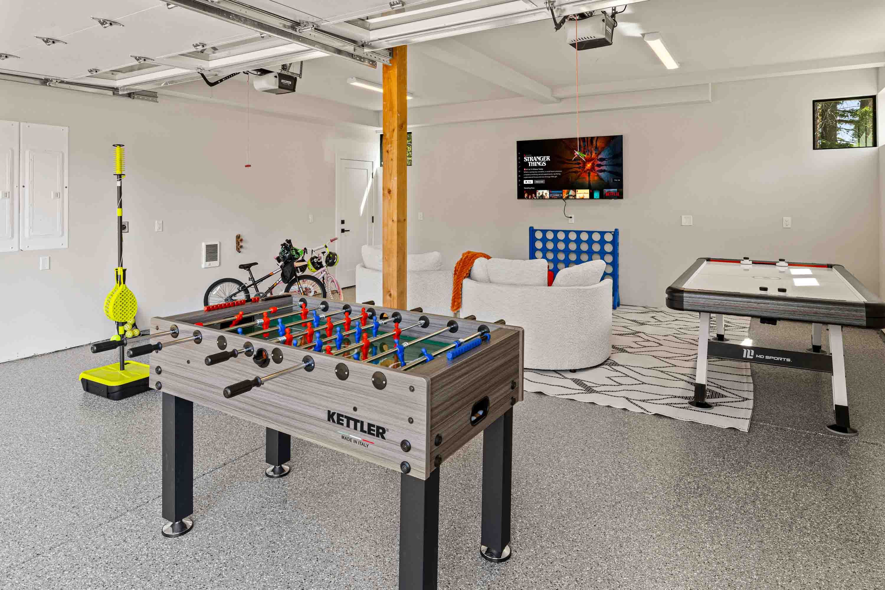 Roll up both doors and the foosball, air hockey, giant Connect Four, and TV are all ready to go