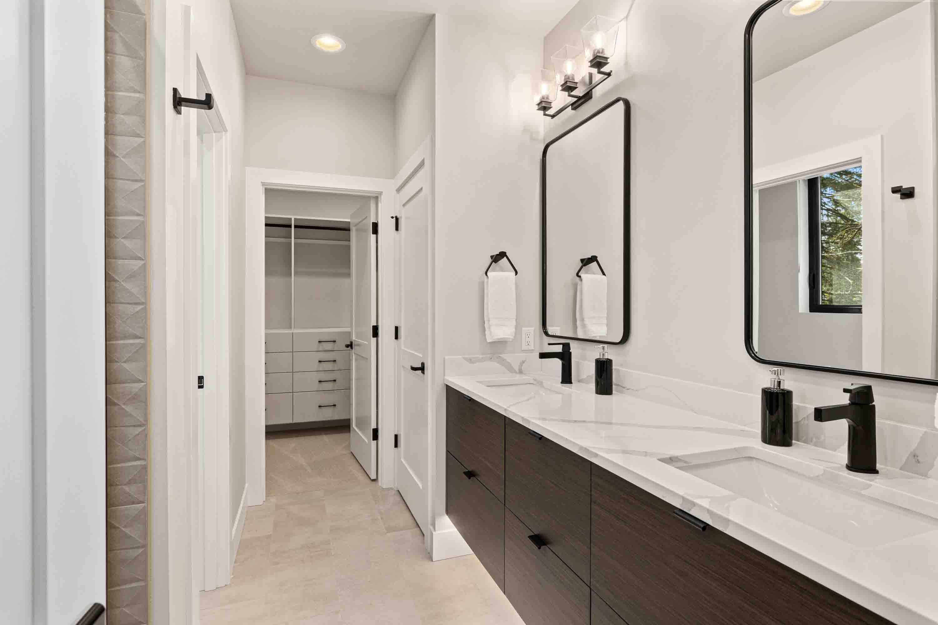 BR3 En Suite — double vanity, walk-in closet, walk-in glass shower with textured tile