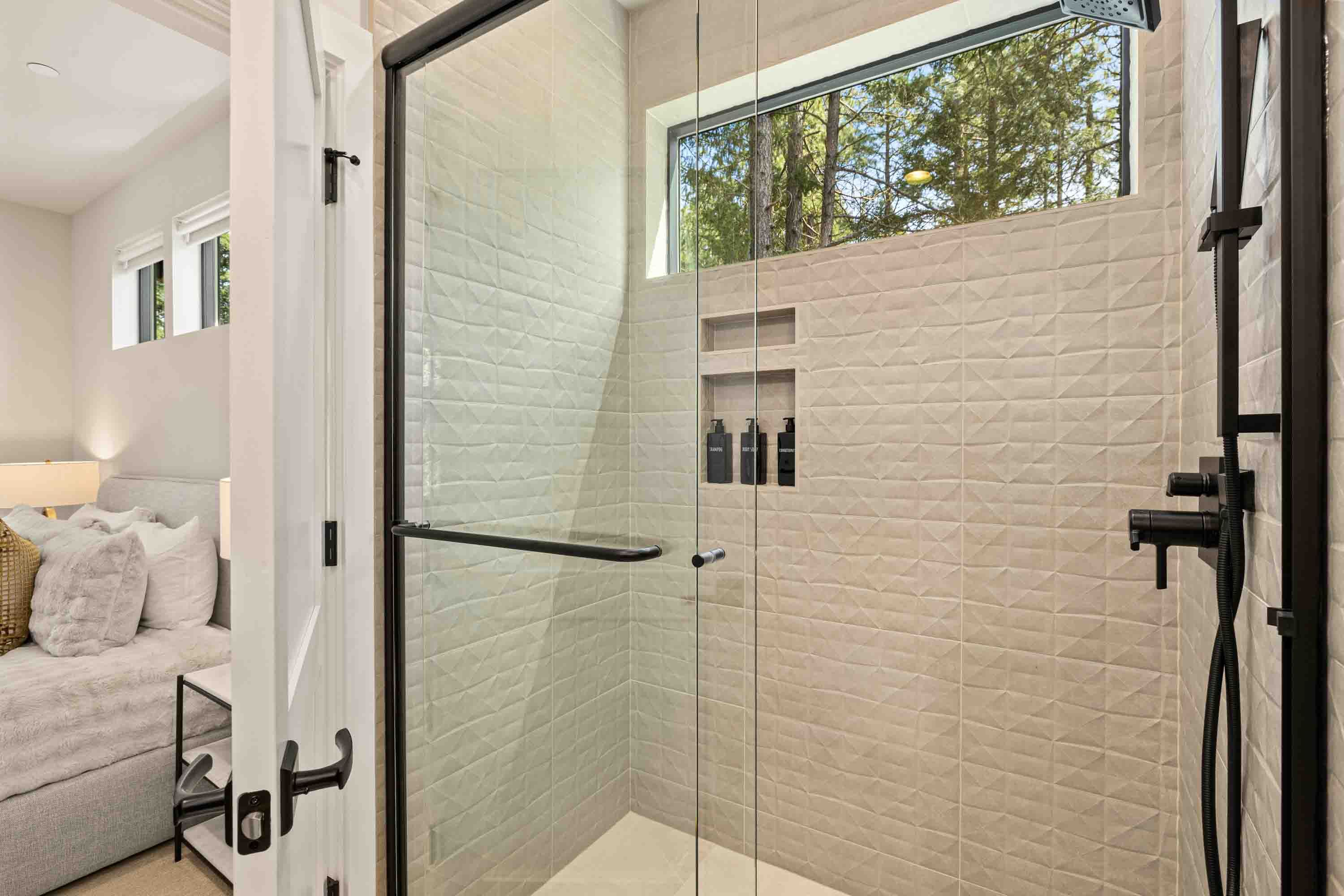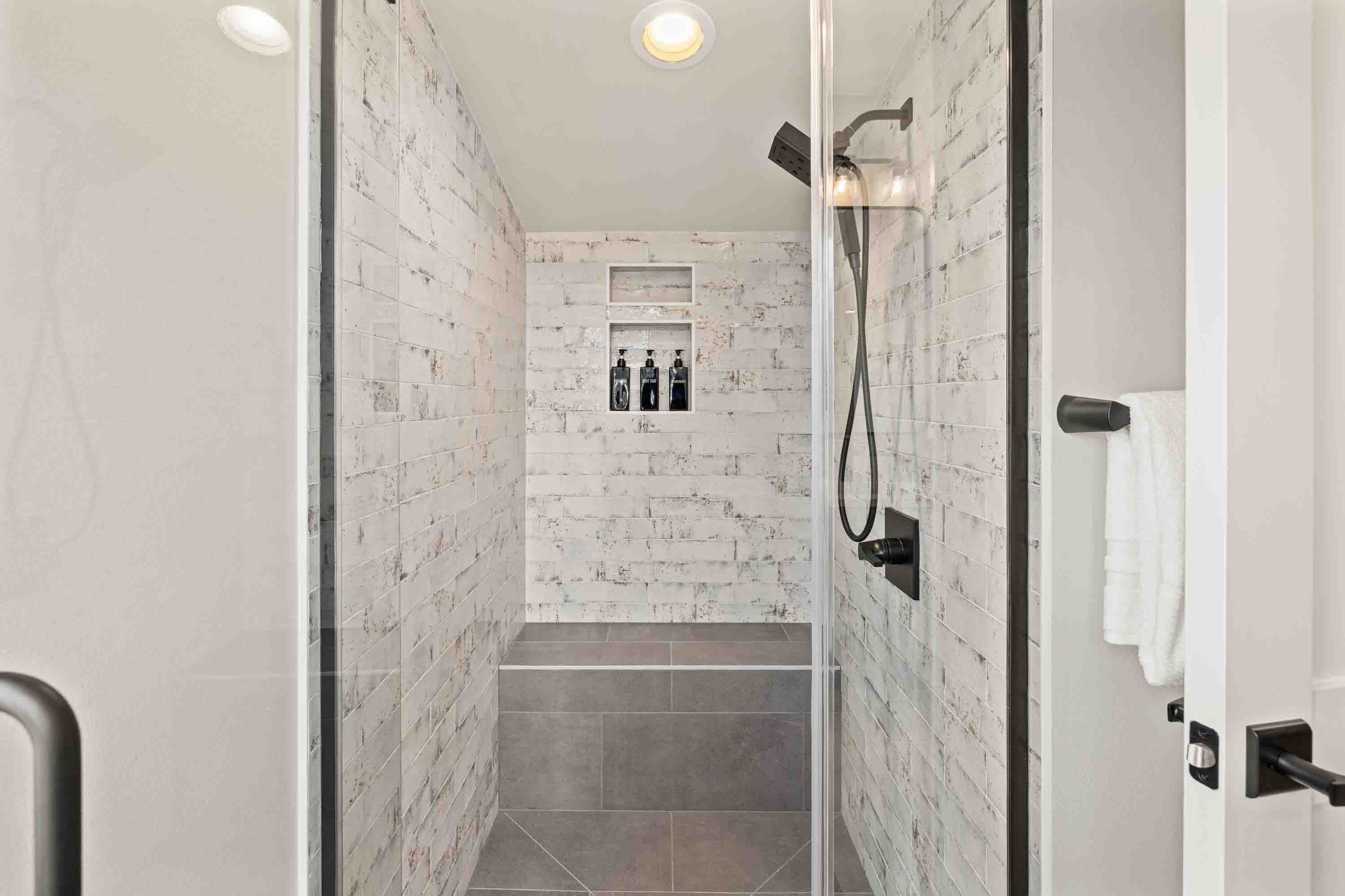BR2 En Suite — single vanity, walk-in glass shower with textured tile