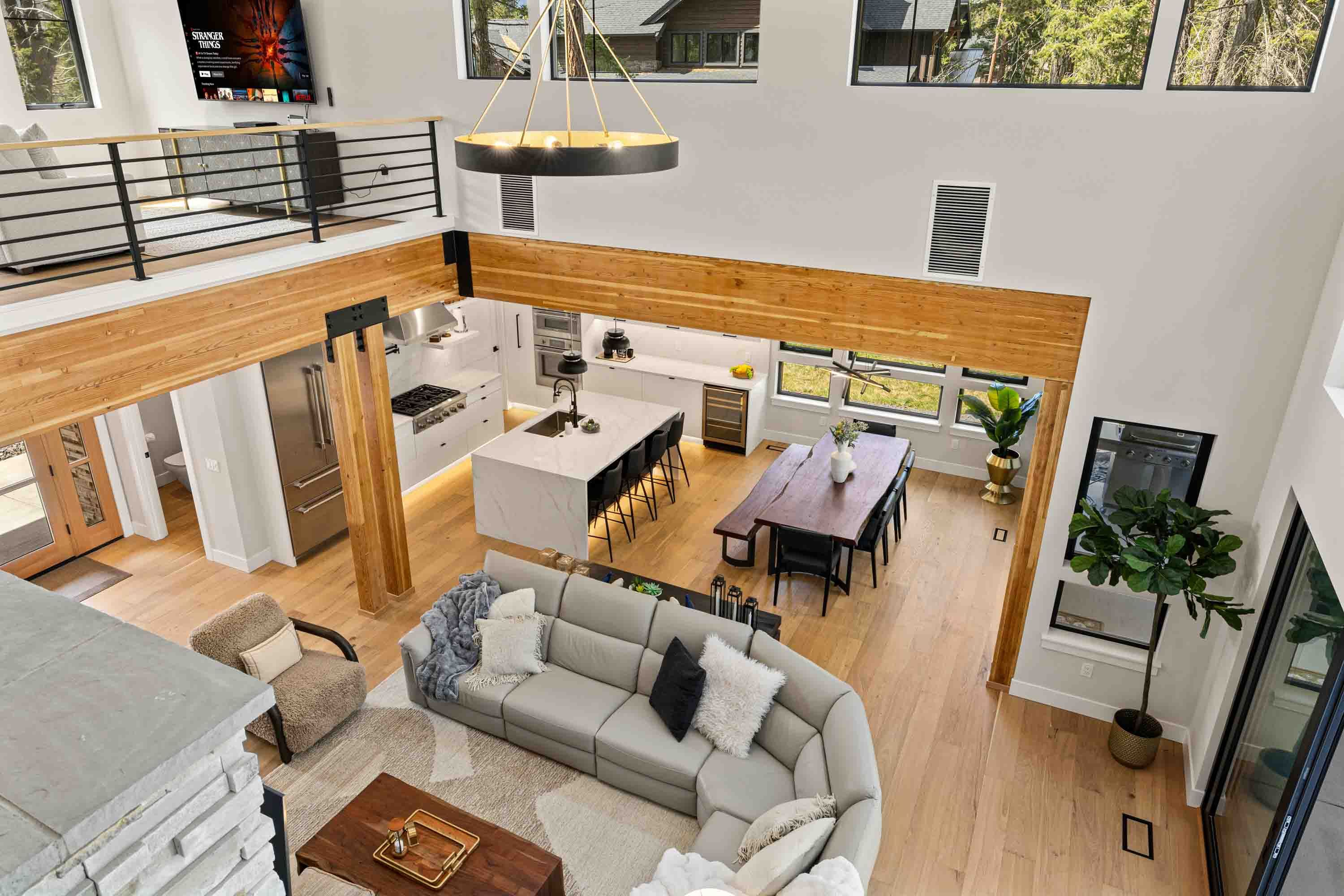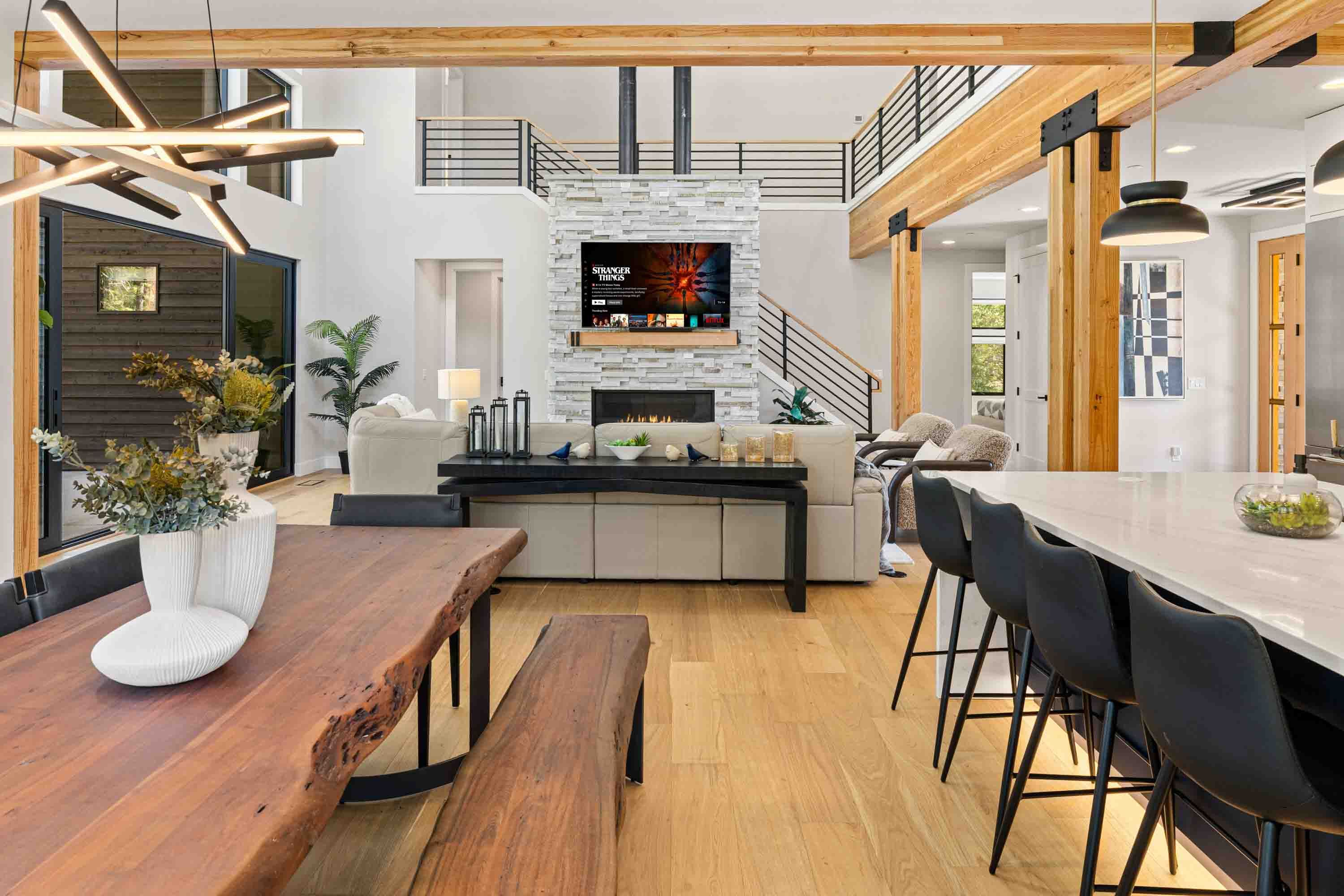 From the live-edge table you can see the fireplace, the loft, and the kitchen — nothing feels far away