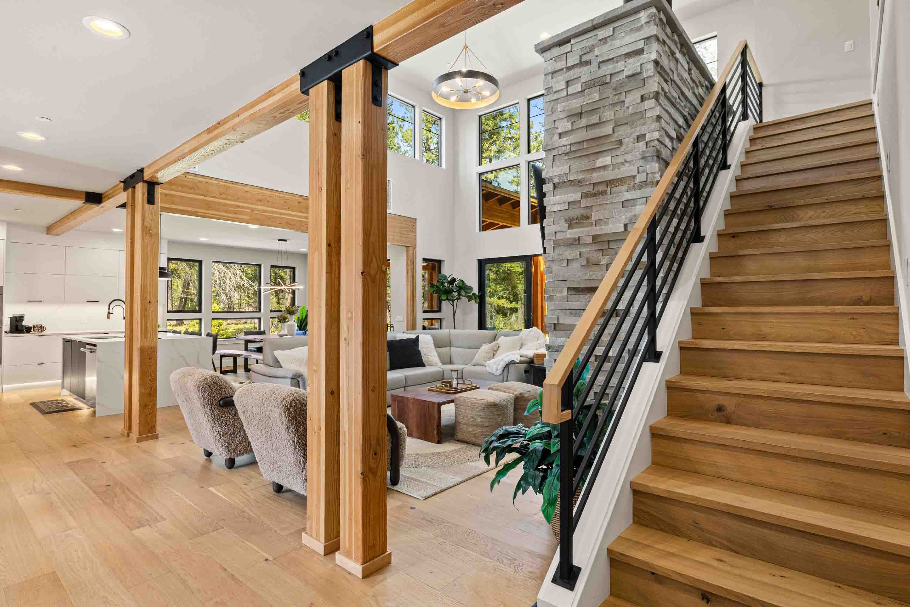 The timber beam framing and stacked stone fireplace make even the staircase feel like part of the design