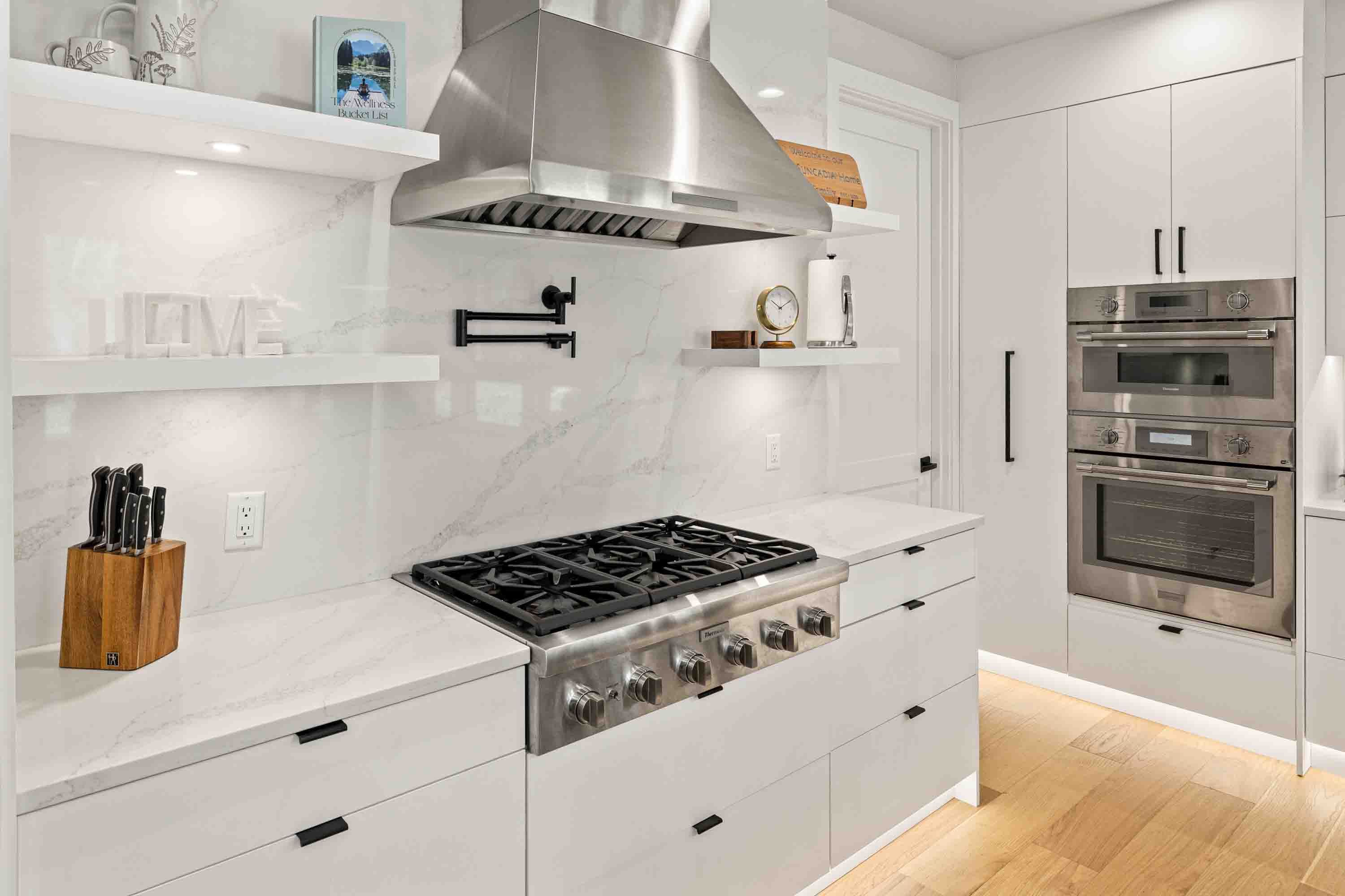 All-white marble, a Thermador six-burner range, and double ovens — this kitchen doesn't cut corners.