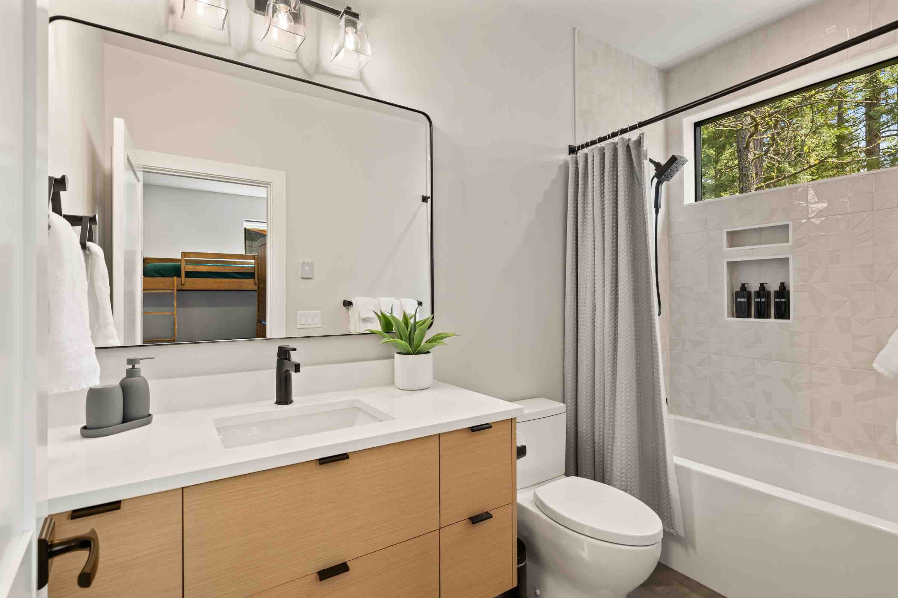 BR 4 Upper Floor En Suite Bath — single vanity, tub/shower combo with textured tile