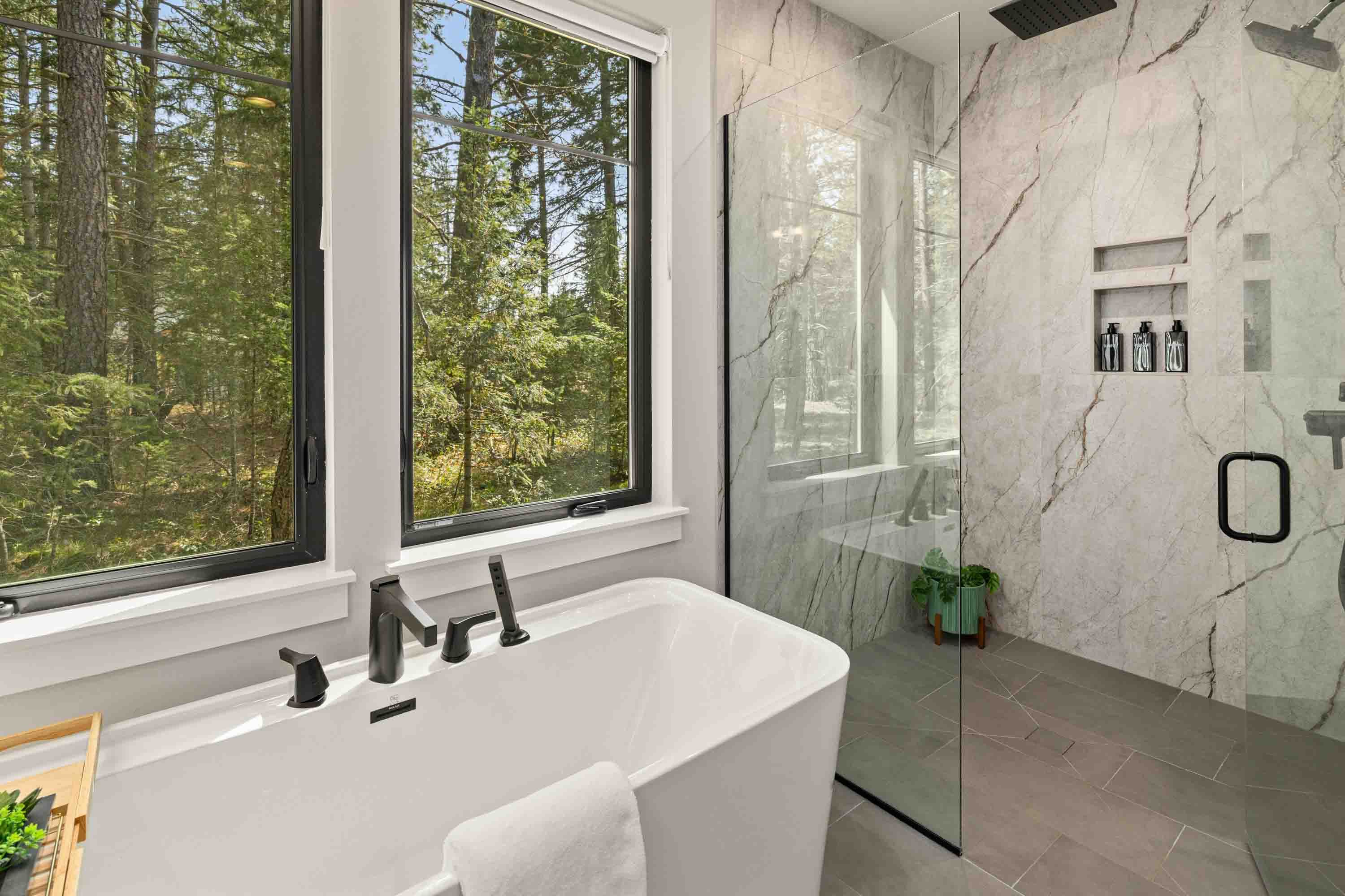 The soaking tub faces the forest and the marble walk-in shower has a rain head