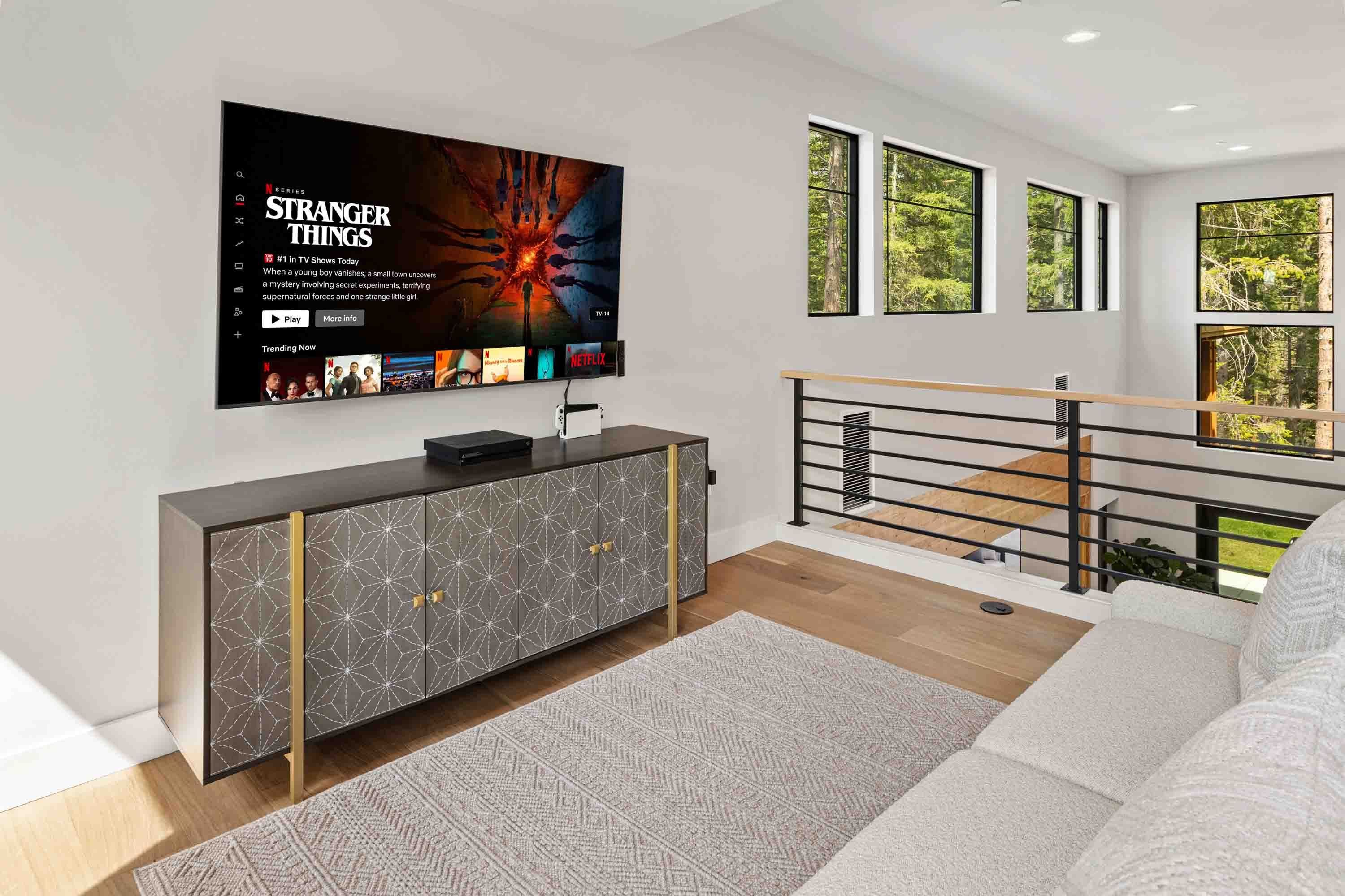 The oversized TV and that geometric credenza make this loft corner feel intentionally designed