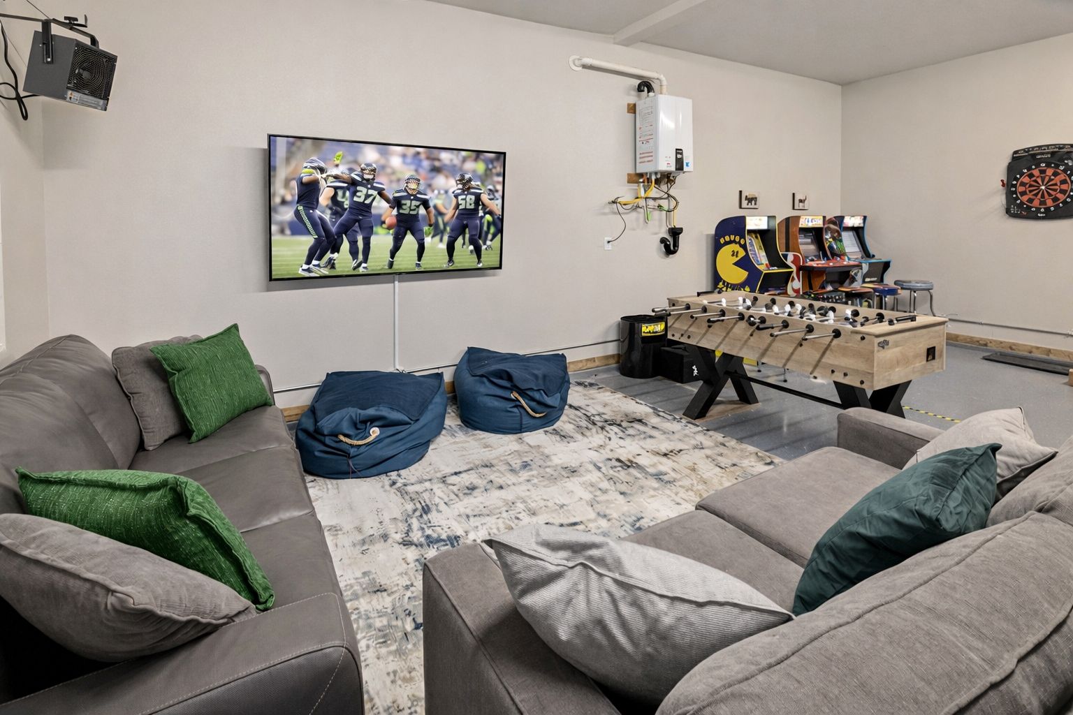 Garage game room — Two large sofas plus full game setup for evening fun