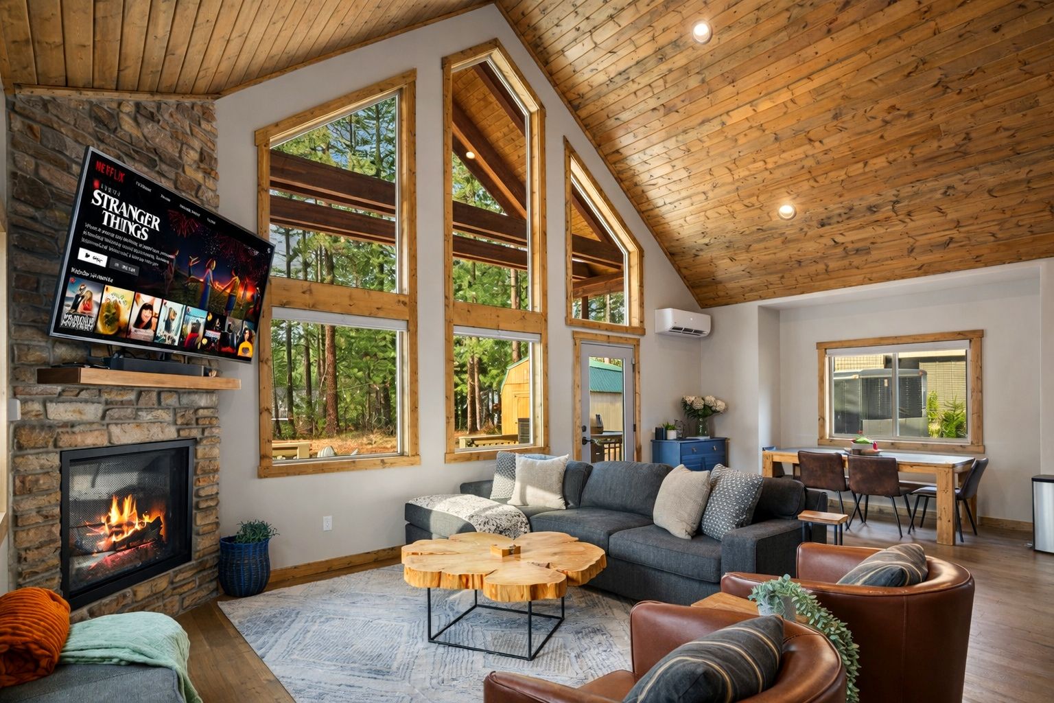 Great room — vaulted ceilings, stone gas fireplace & open-plan living