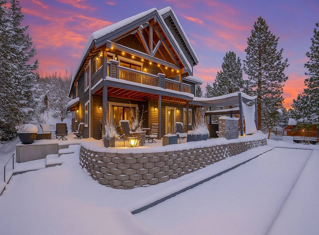 Grand Mountain Lodge With Glowing Timber Facade And Signature Peak Roofline