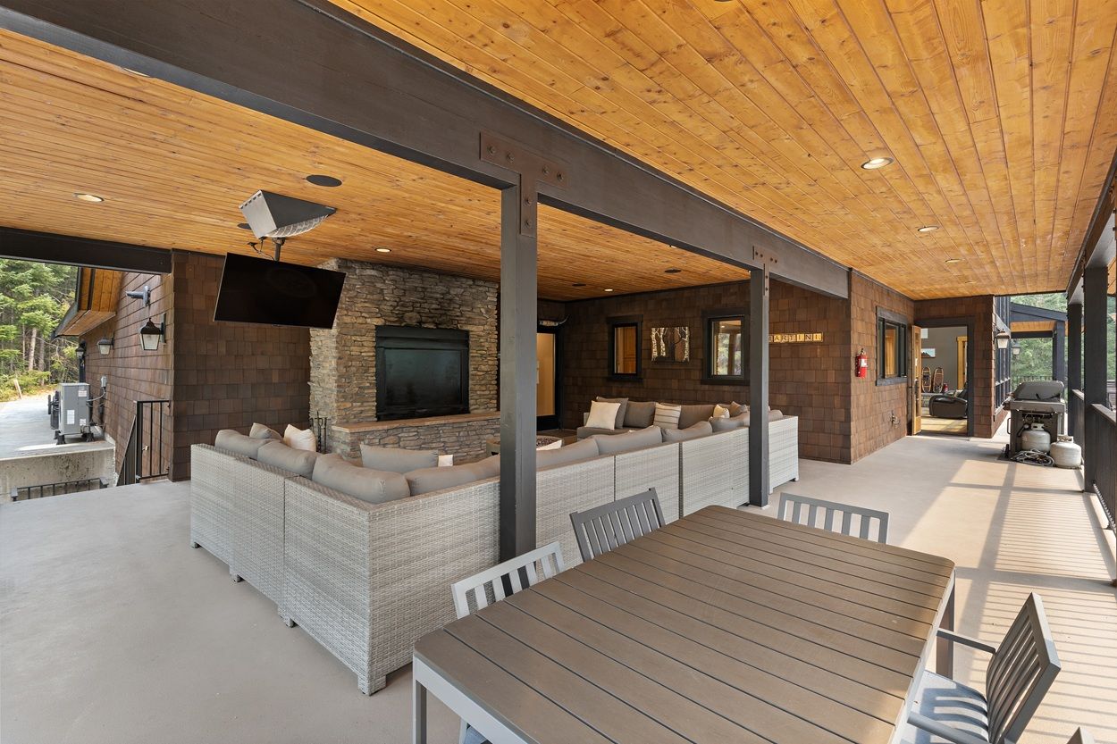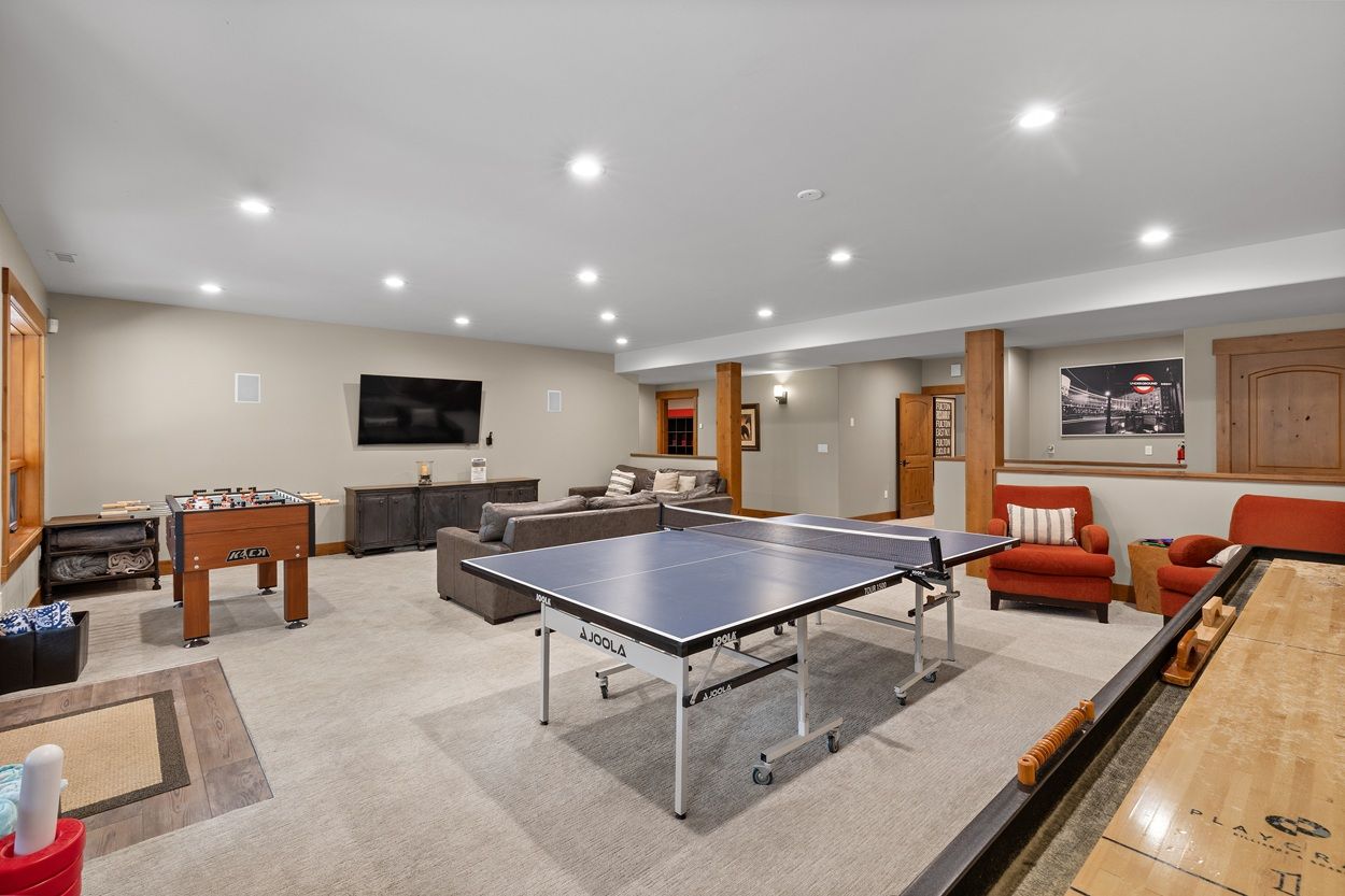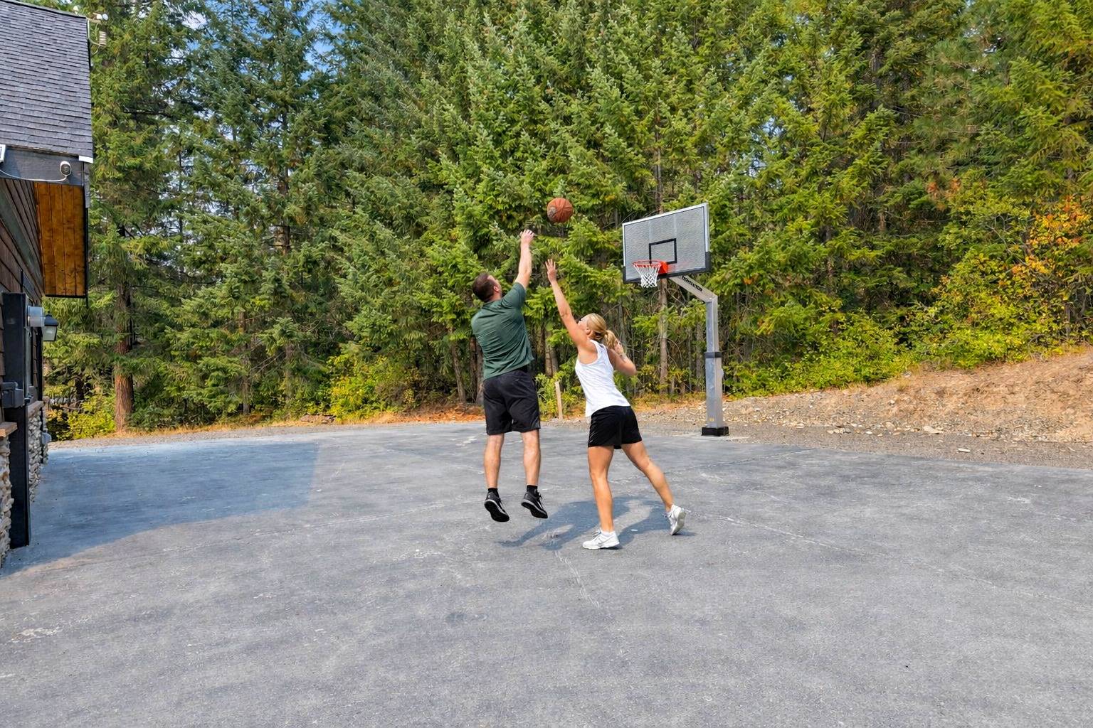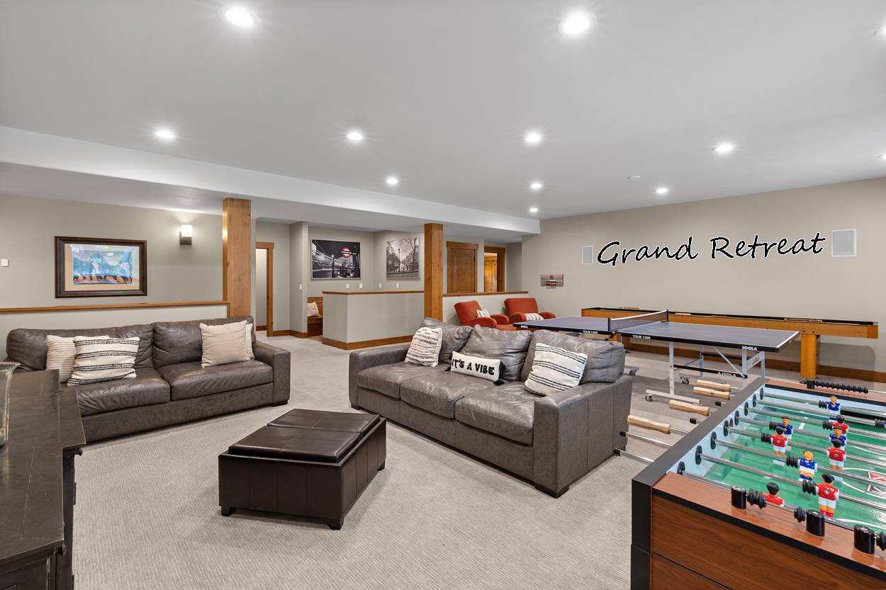 Backyard Firepit Lounge – Great for Toasty Evenings + Group FunPrivate Covered Deck with Overhead Heaters, Tv, Firetable, and Lots of Lounge Seating Lower Level Lounge and Game Room Basketball anyone ? Lower Patio – Hot Tub, Loungers + Daybed Seating for All-Day RelaxationBack Deck – Lounge Seating + Hot Tub + Lawn Space for Group HangoutsPrivate Covered Deck with Overhead Heaters, Tv, Firetable, and Lots of Lounge Seating Private Covered Deck with Overhead Heaters, Tv, Firetable, and Lots of Lounge Seating Private Covered Deck with Overhead Heaters, Tv, Firetable, and Lots of Lounge Seating Lower Level Lounge and Game Room Covered Deck – Large Covered Hot Tub + Lounge Seating for Post-Adventure SoakMain Floor - Bedroom 1 Master Suite with a King Size Bed + Warm Decor for Peaceful NightsMain Floor– Master Suite w/ King Bed + Deck Access + Gas Fireplace Main Floor – Bathroom, Soaker Tub + Dual Sinks for Spa-Like ComfortMain Floor – Soaker Tub, Rain Shower + Tile Details for Daily IndulgenceMain Floor - Bedroom 2 with a King Size Bed + Ensuite Bathroom + + Stylish Touches for Restful SleepBedroom 2 En Suite Bathroom with shared access for the main floor guests + Dual Vanities for Streamlined Morning RoutinesBedroom 2 En Suite Bathroom with shared access for the main floor + Walk-in Shower Bathroom 3 Located on the Main Floor + Bright Layout + Shower Combo for All AgesUpper Floor - Bedroom 3 + Six Twin Beds + Modern LayoutUpper Floor - Bedroom 3 + Six Twin Beds + Modern LayoutUpper Floor - Bedroom 3 + Six Twin Beds + Modern LayoutEn Suite Bathroom for Bedroom 4 Top Floor Bunk Room, No Shower, Toilet + Vanity Sink Lower Floor - Bedroom 4 + King Size Bed Attached Bathroom + Reading NookBathroom 4 attached to Bedroom 5 with a second access door to the lower floorBathroom 5 attached to Bedroom 5 with a second access door to the lower floor + Rainfall HeadBathroom 5 attached to Bedroom 5 with a second access door to the lower floor + Rainfall HeadLower Floor - Bedroom 5 + Queen Size Bed + Perfect for Families or GroupsLower Floor - Bedroom 6 + King Size Bed + Bench Seating + Nightstand Lighting + StorageBathroom 6 attached to Bedroom 5 with a second access door to the lower floor + Rainfall HeadLower Floor - Bedroom 7 + Four Queen Size Beds + Sleeping for 8, Great for Kids or Larger GroupsLower Floor - Bedroom 7 + Four Queen Size Beds + Sleeping for 8, Great for Kids or Larger GroupsLower Floor - Bedroom 7 + Four Queen Size Beds + Large Sofa + TV Setup for Movie MarathonsMain Floor – Laundry Room, Washer/Dryer + Full-Length Wood CabinetryKitchenette + Extra Fridge + Prep Space for Easy Entertaining