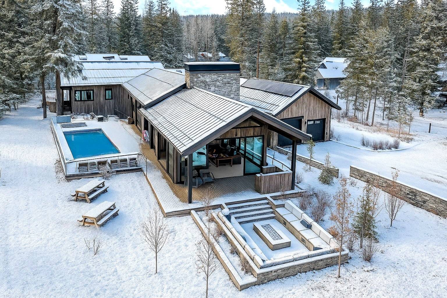 A dramatic modern lodge unfolds into multiple wings of luxury living, surrounded by evergreens and open air serenity.