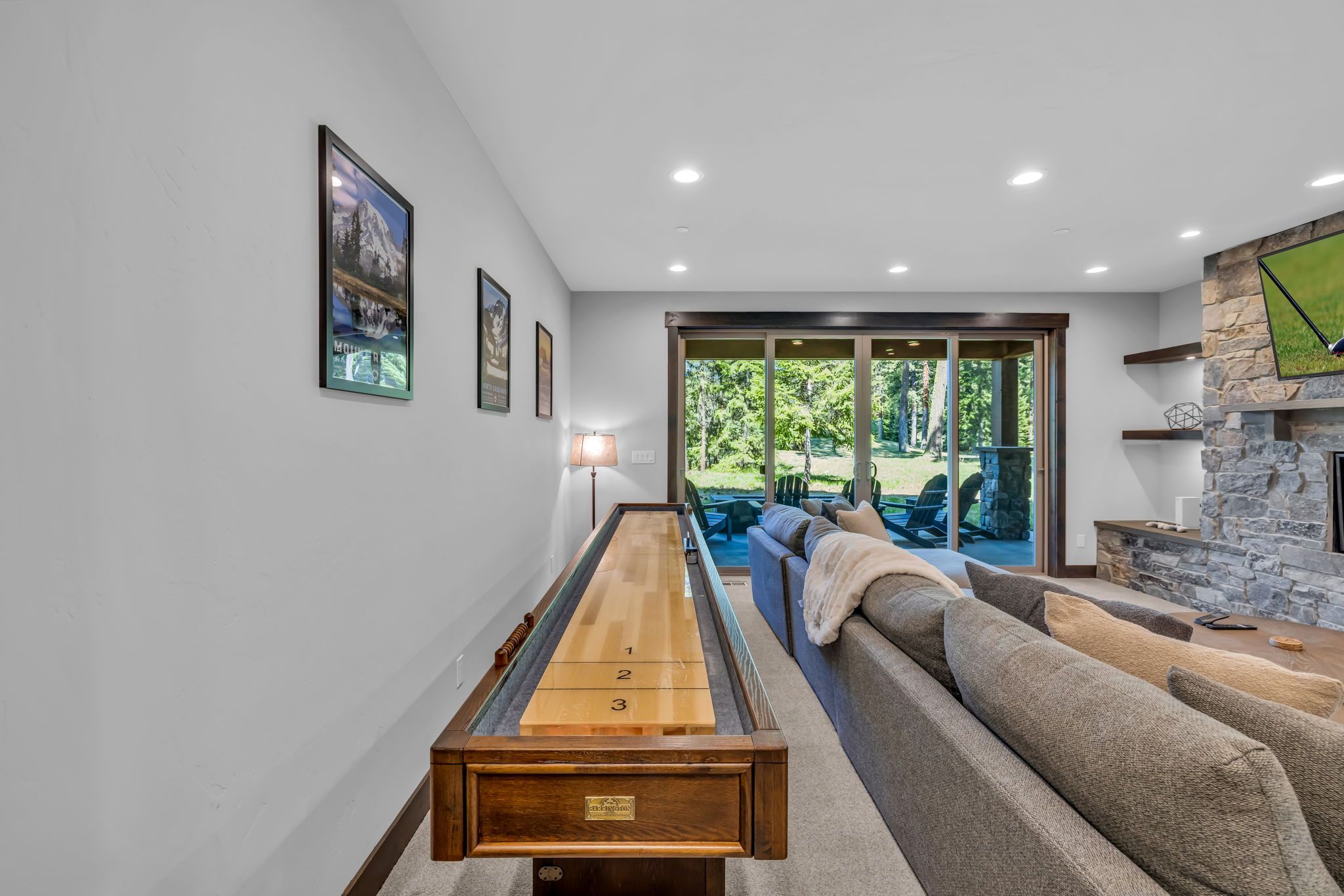 Lower Level – Media Lounge, Stone Fireplace + Patio Access w/ Forest Views
