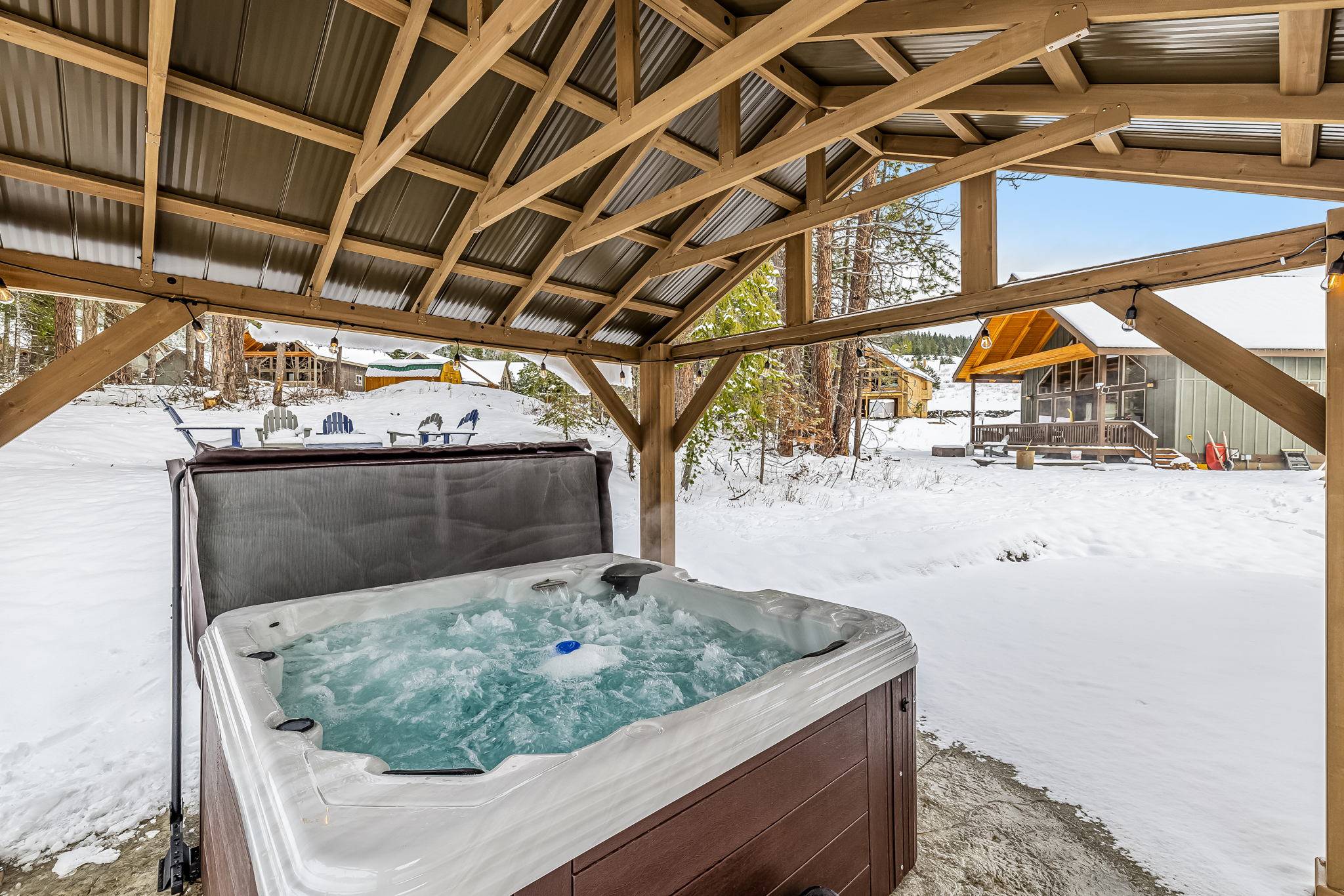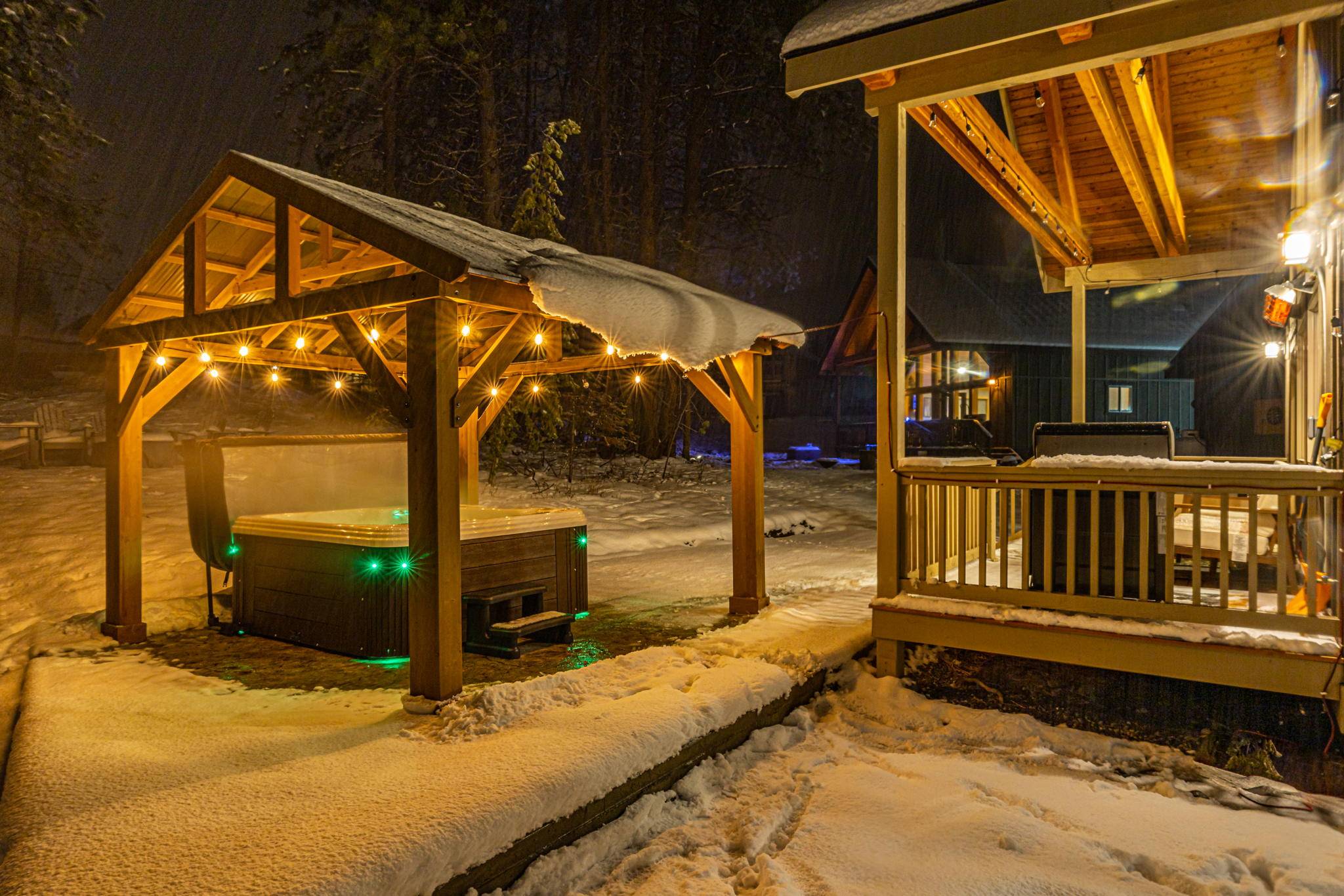 Charming retreat with covered hot tub, inviting patio, and timber-framed charm.