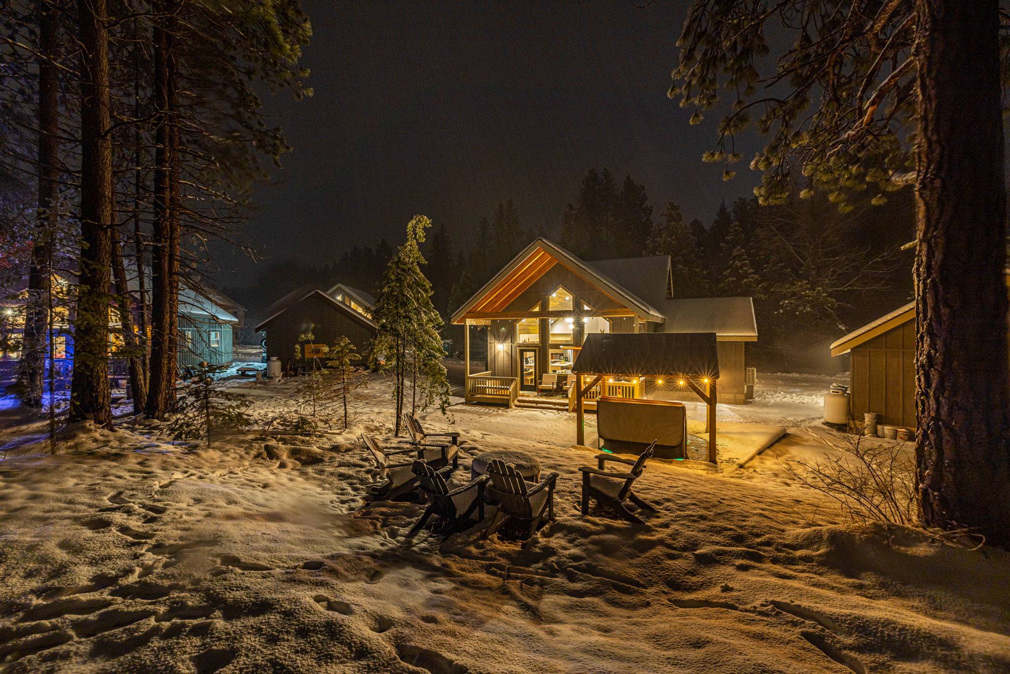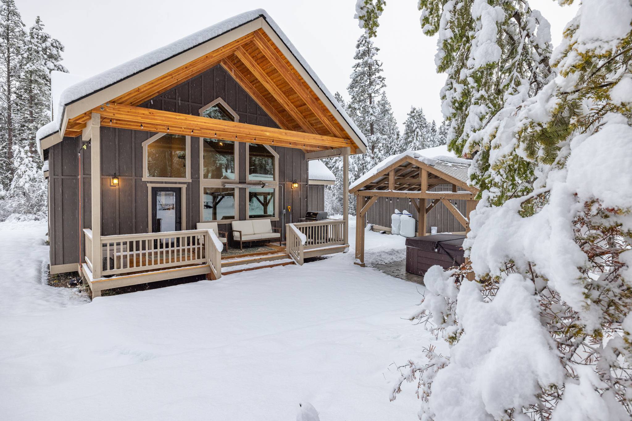 Rustic-modern cabin with full-width covered porch and cozy curb appeal