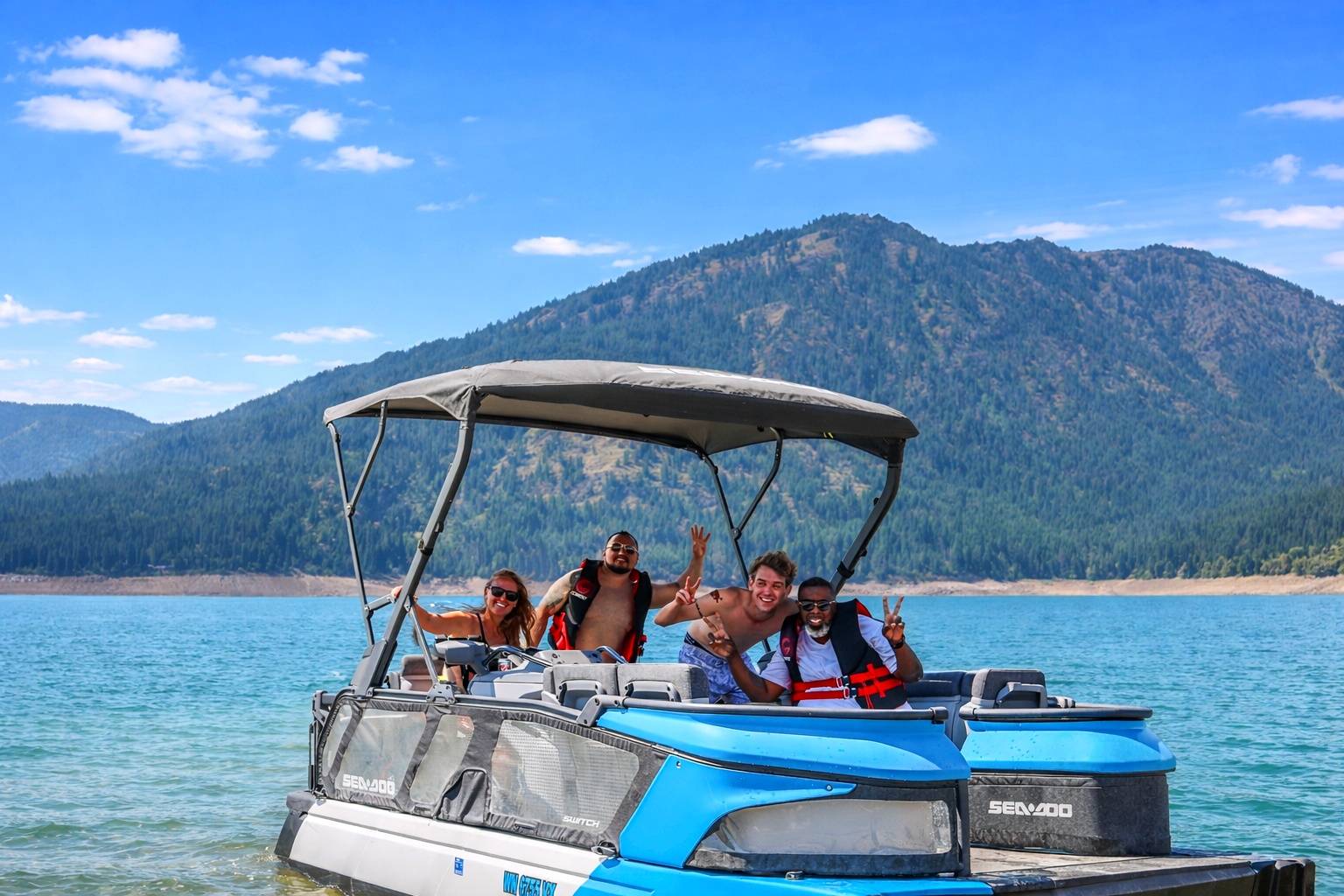 Rear Exterior – Modern Wood + Glass Design with Gas Firepit + Soft Seating + Shade for Post-Adventure Drinks