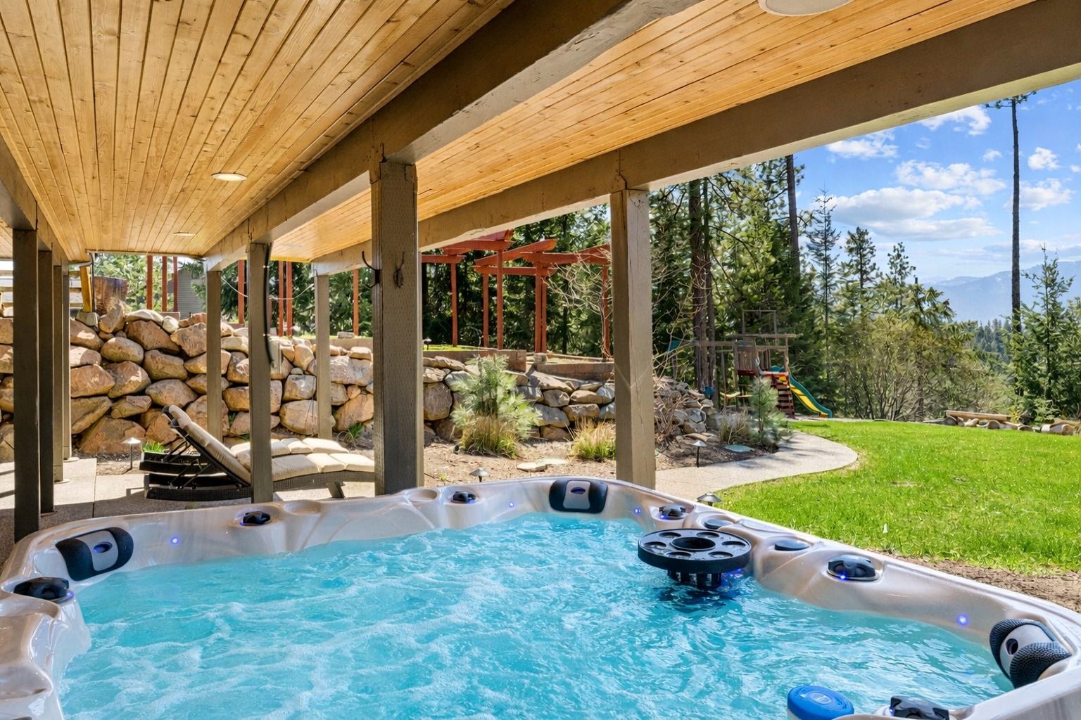Grand mountain lodge with full-width deck, hot tub, and lush grassy yard