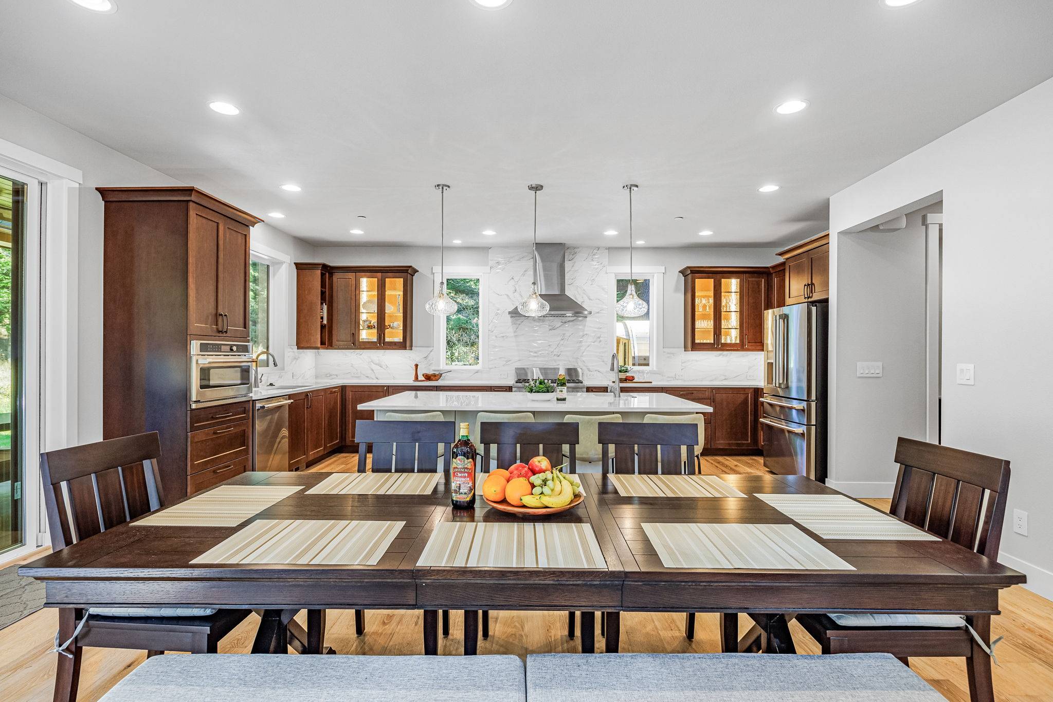 Open kitchen and dining area flowing into stone hearth fireplace and great room ambiance