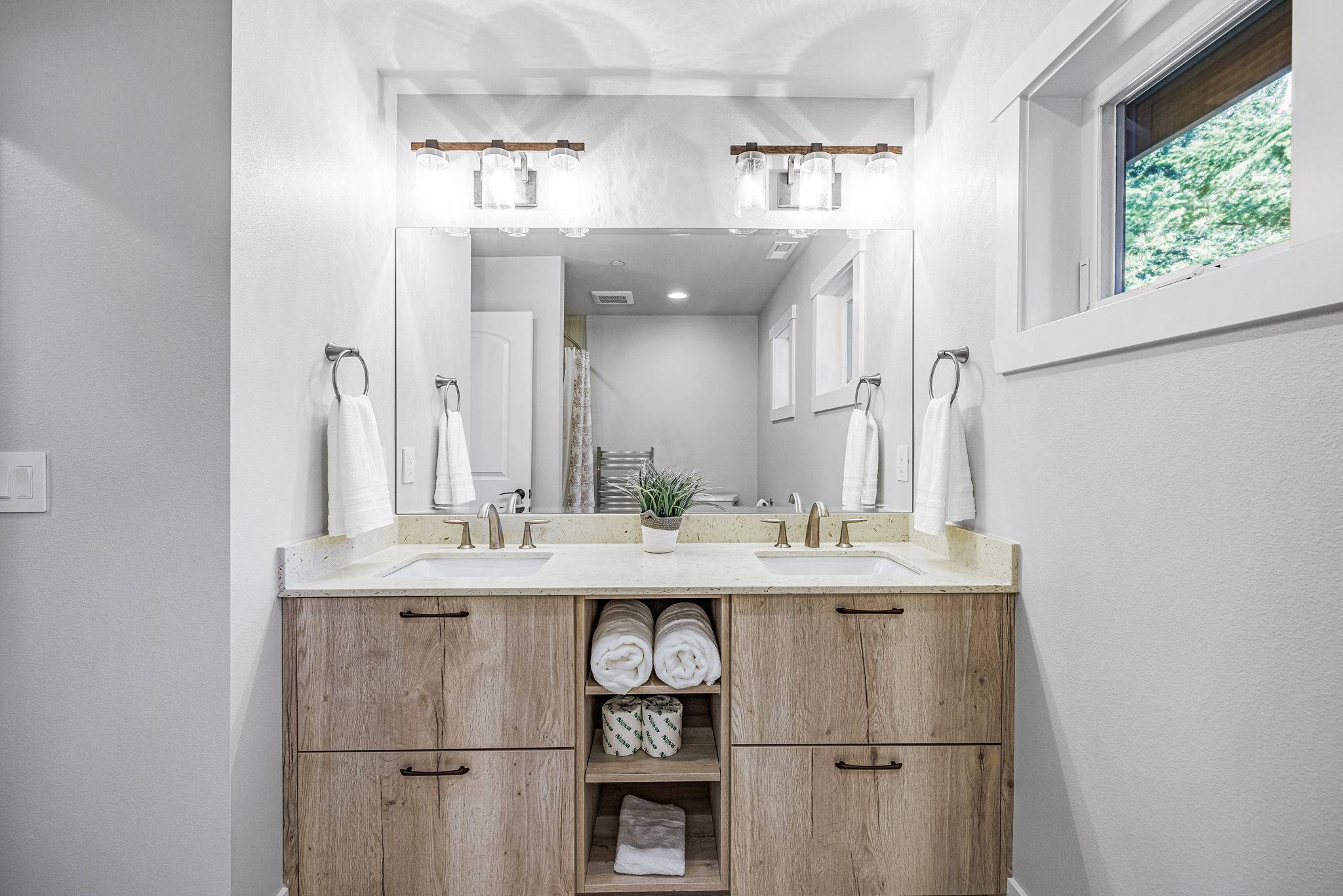 En Suite Bathroom to Bedroom 3 w/ Double Sinks, Frameless LED Mirrors, Heated Floors, and Towel Rack