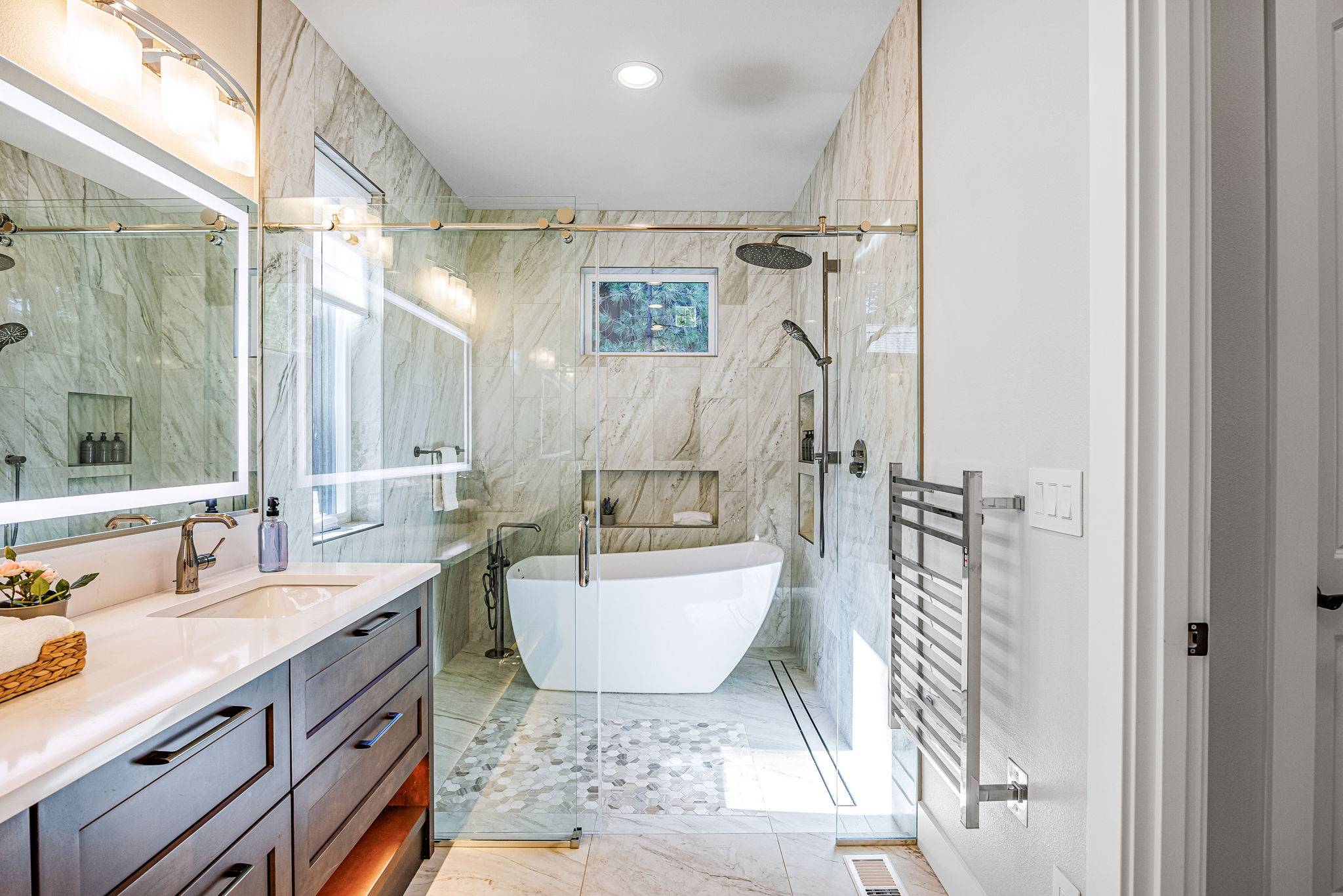 5 Piece Super Lux Master Suite Bathroom w/ Heated Floors, Towel Rack and Frameless LED Mirror