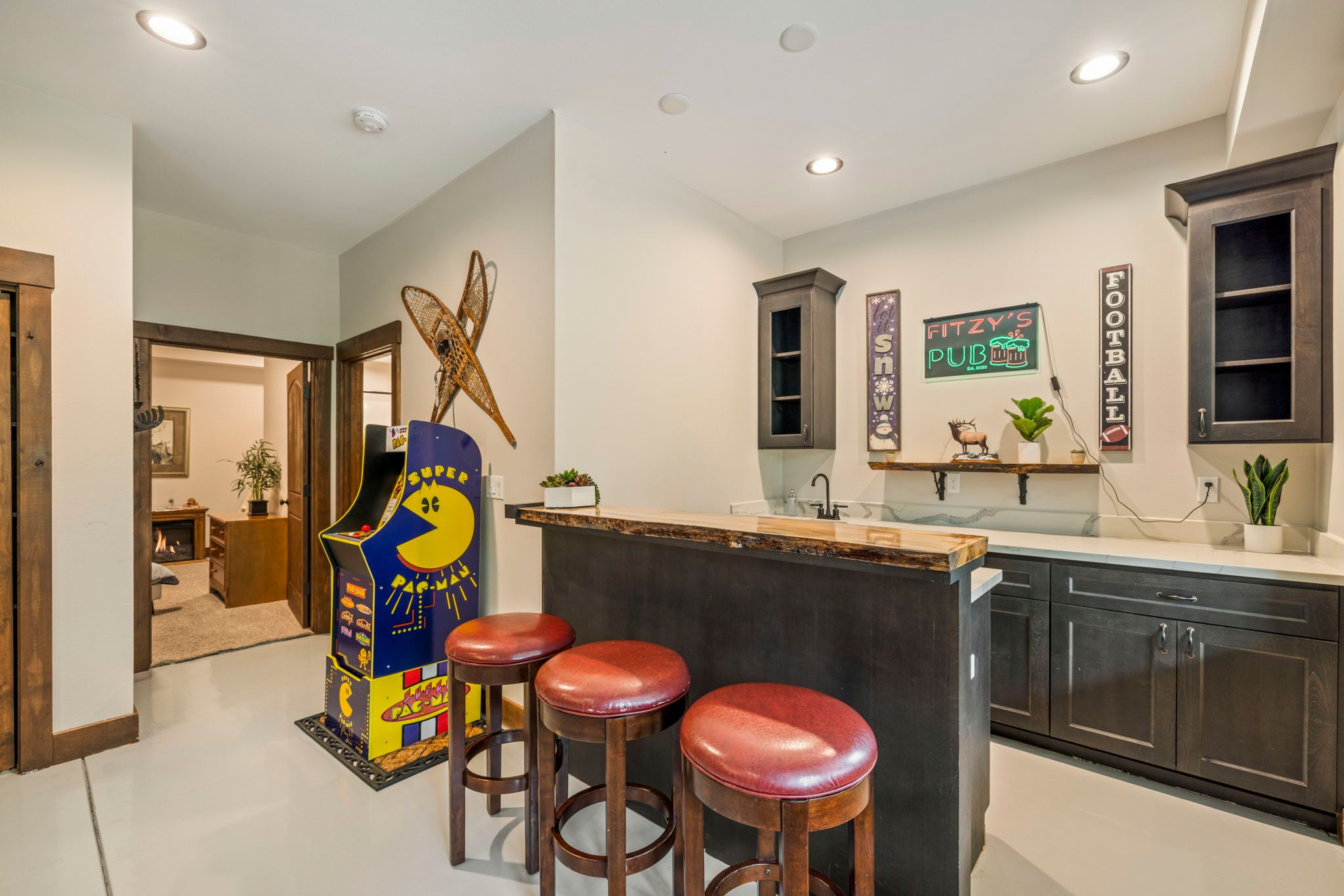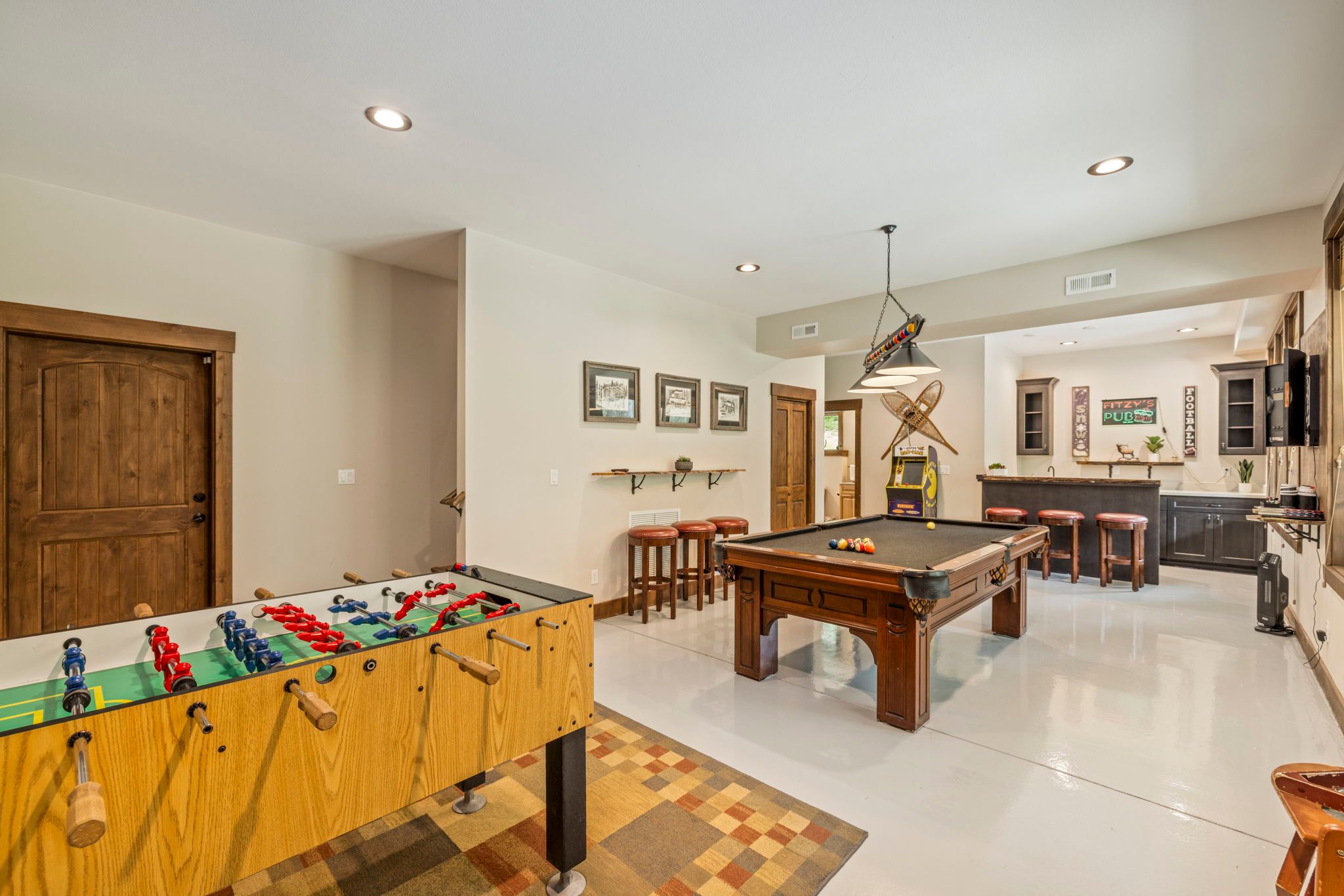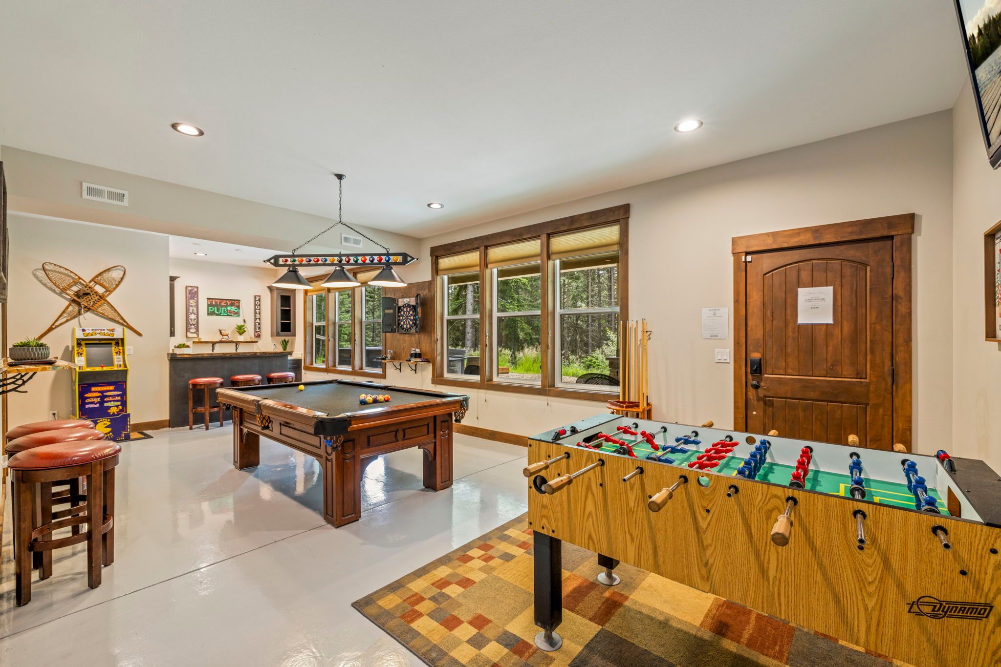 * Game Room, Pool Table, Ping Pong, Darts, Foosball, Video game console, Arcade Pac Man and Entertaining Bar.