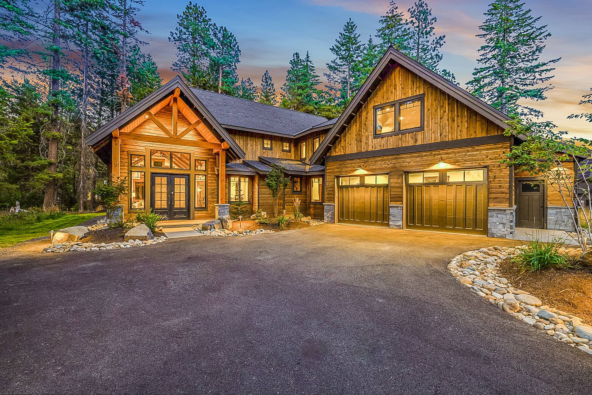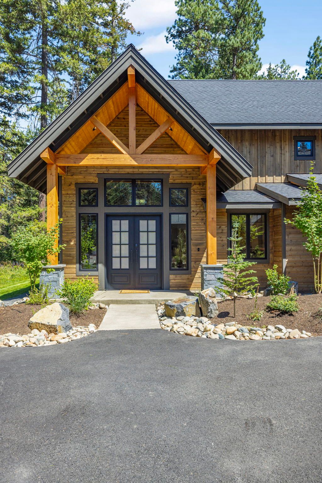Rustic timber-frame retreat with covered porch, hot tub, and wide-open lawn