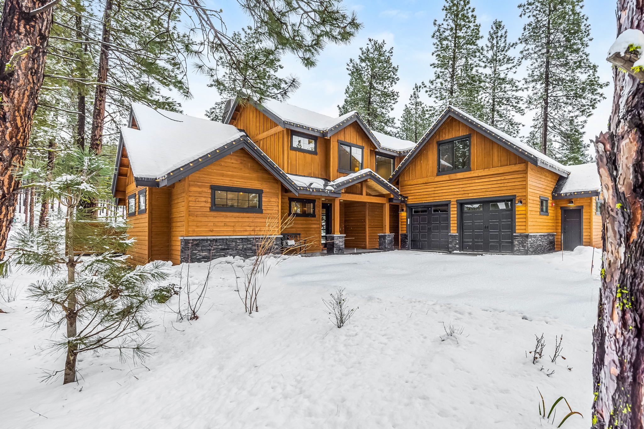 This architectural masterpiece glows at dusk with expansive windows and luxury lodge presence