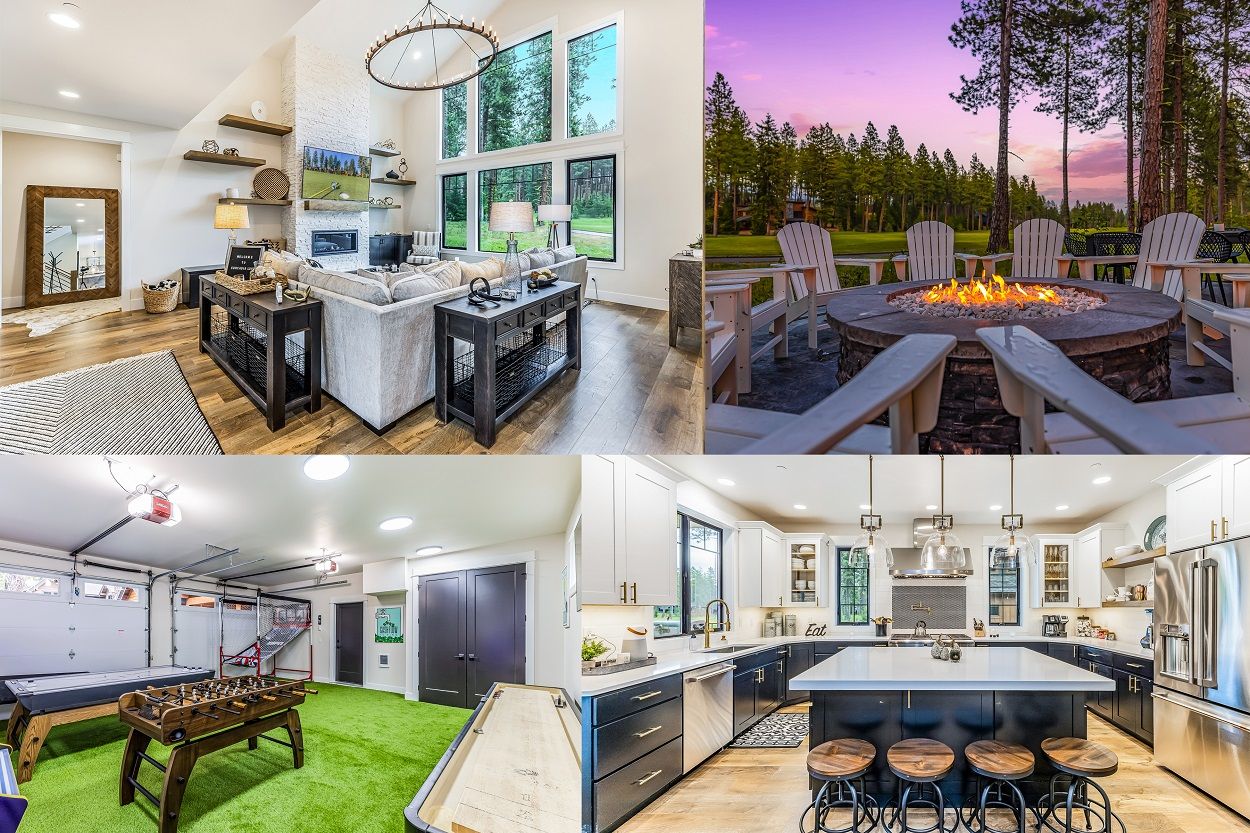 Striking mountain-style home with dramatic rooflines and a glowing twilight welcome