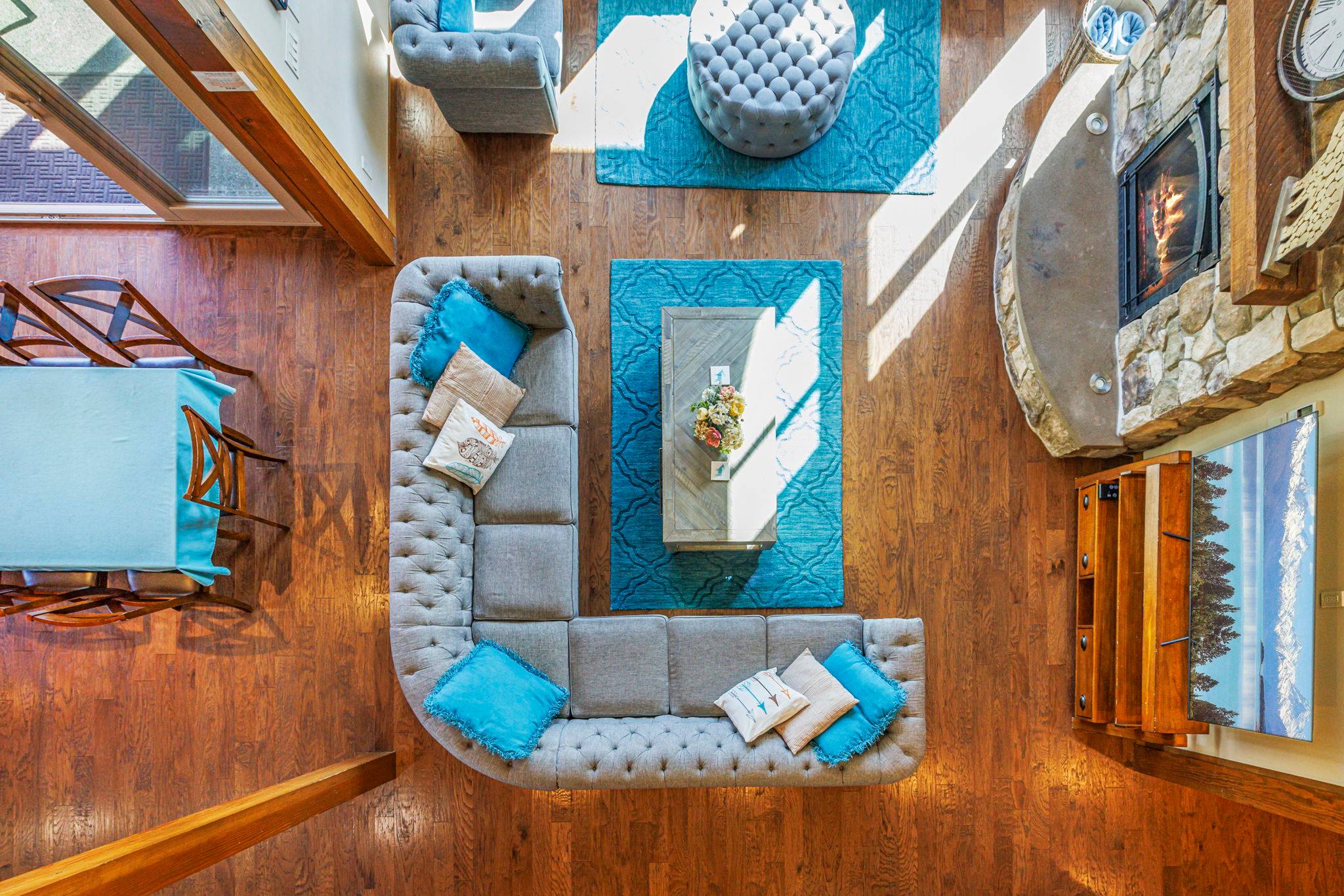 Chic open-concept lounge with exposed beams and sophisticated lodge comfort.