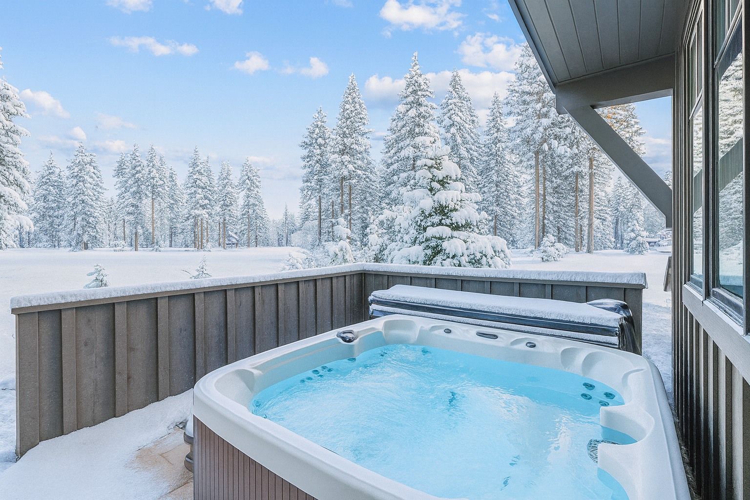 Secluded timber-frame lodge with upper balcony, covered patio, and cozy outdoor lounge