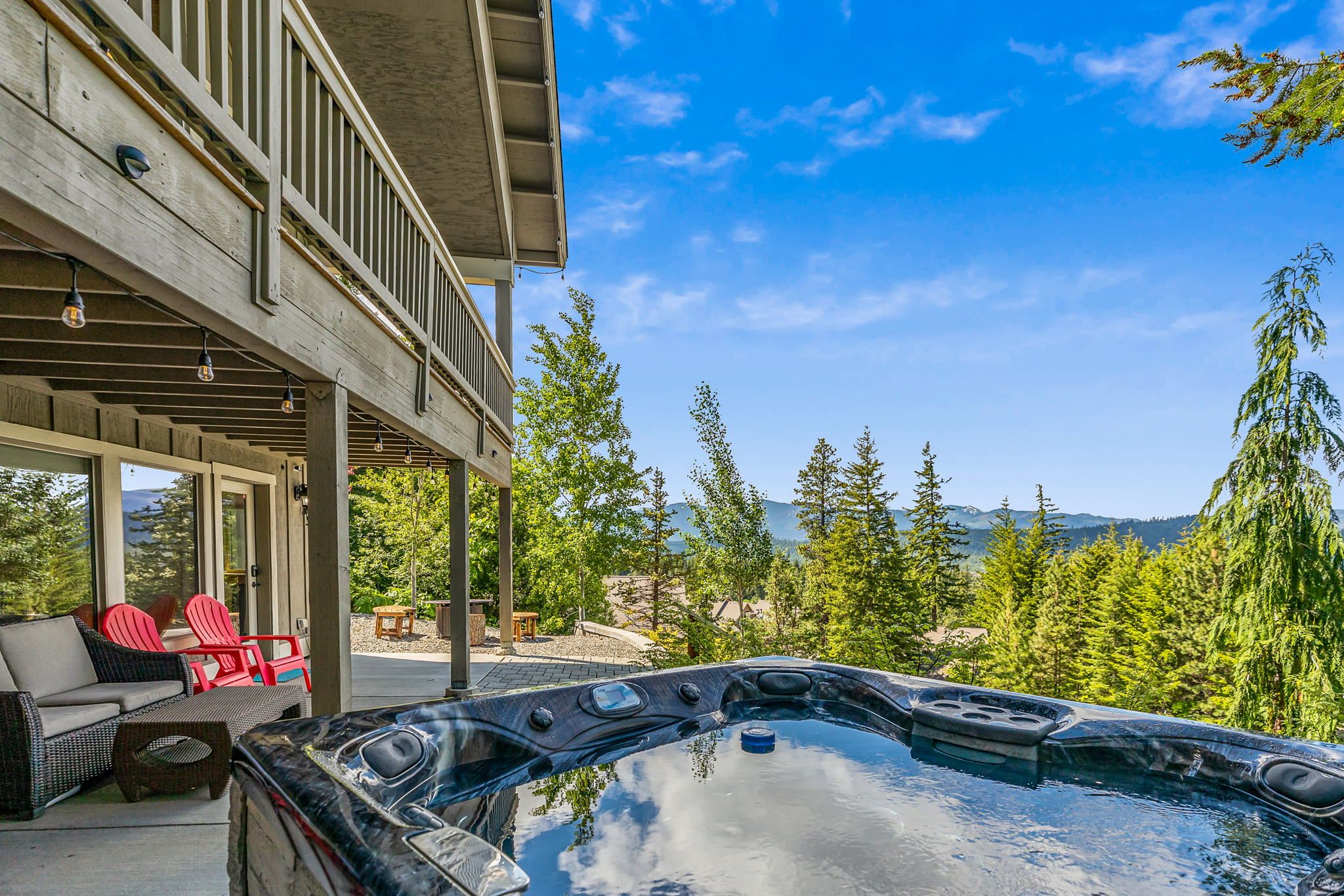 Shaded patio retreat with string lights, lounge area, and private entry to the hot tub