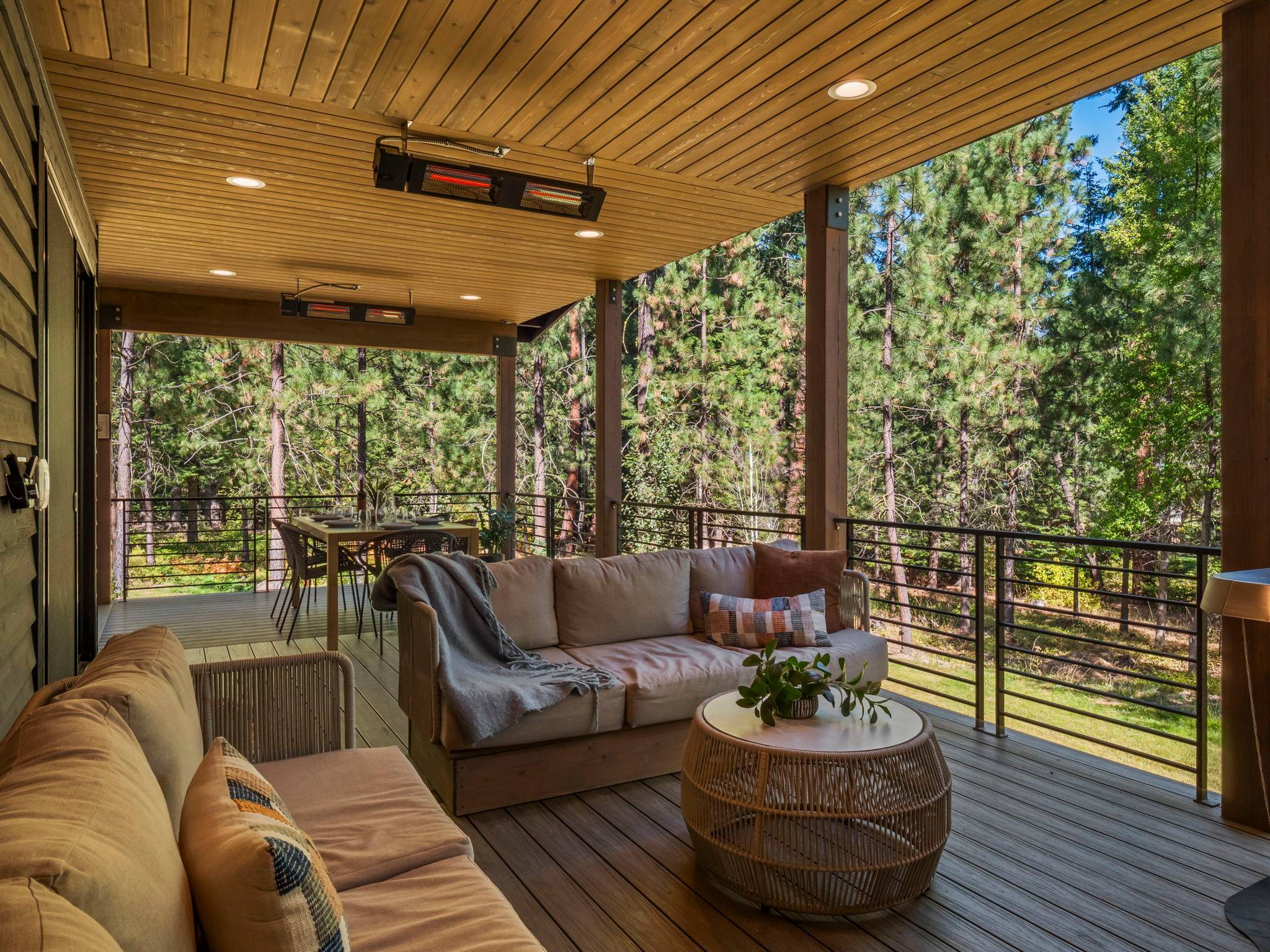 Outdoor Living - Covered deck with outdoor dining, lounge seating, built-in overhead heaters, BBQ grill, and wall-mounted TV.