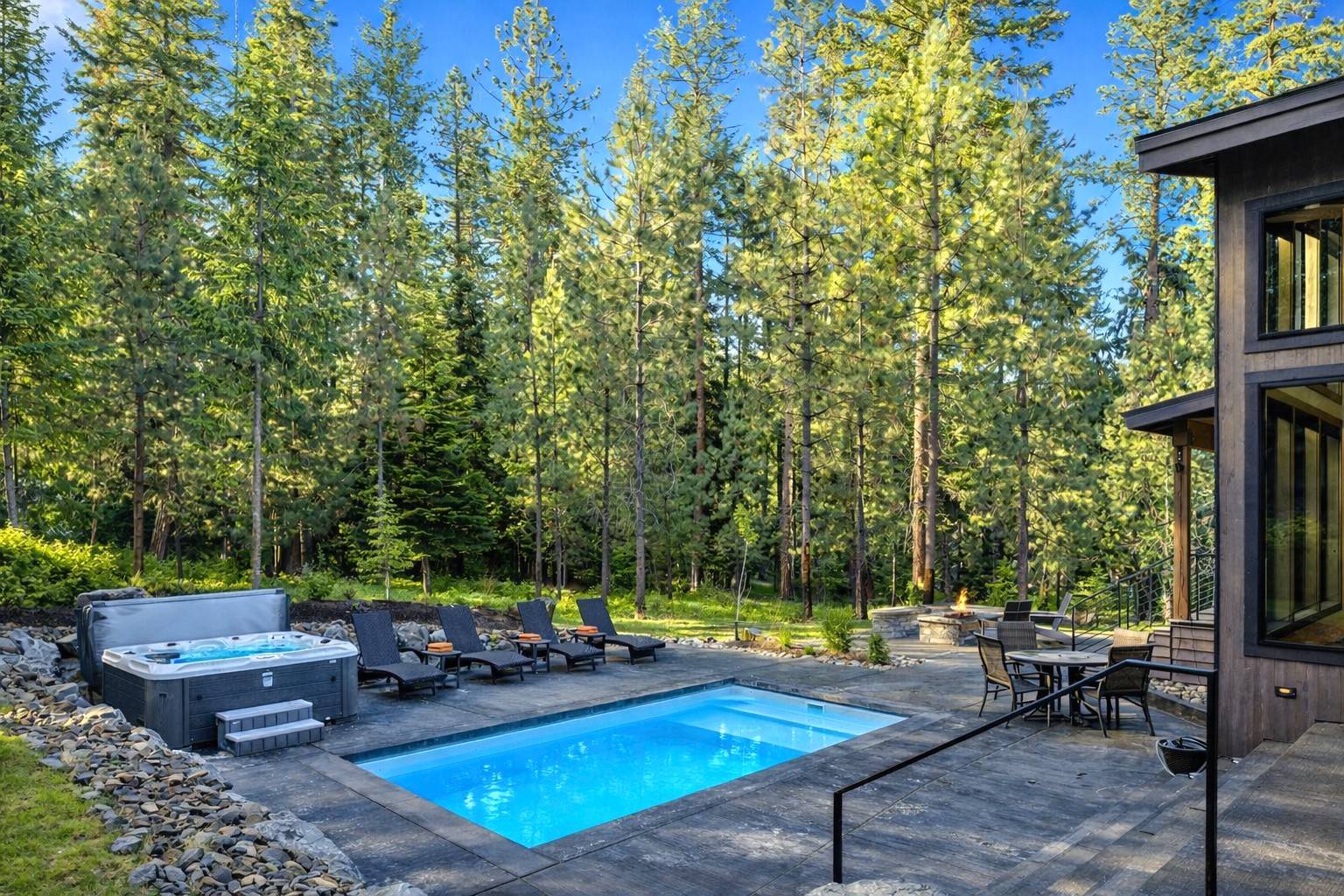 Outdoor Living – Modern Mountain Retreat with Private Pool, Hot Tub, and Expansive Deck Space.
